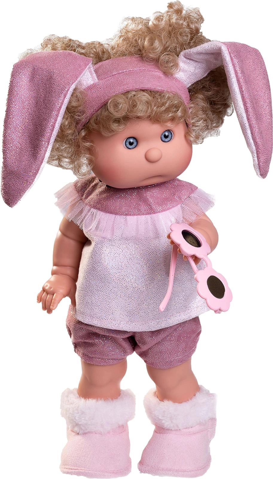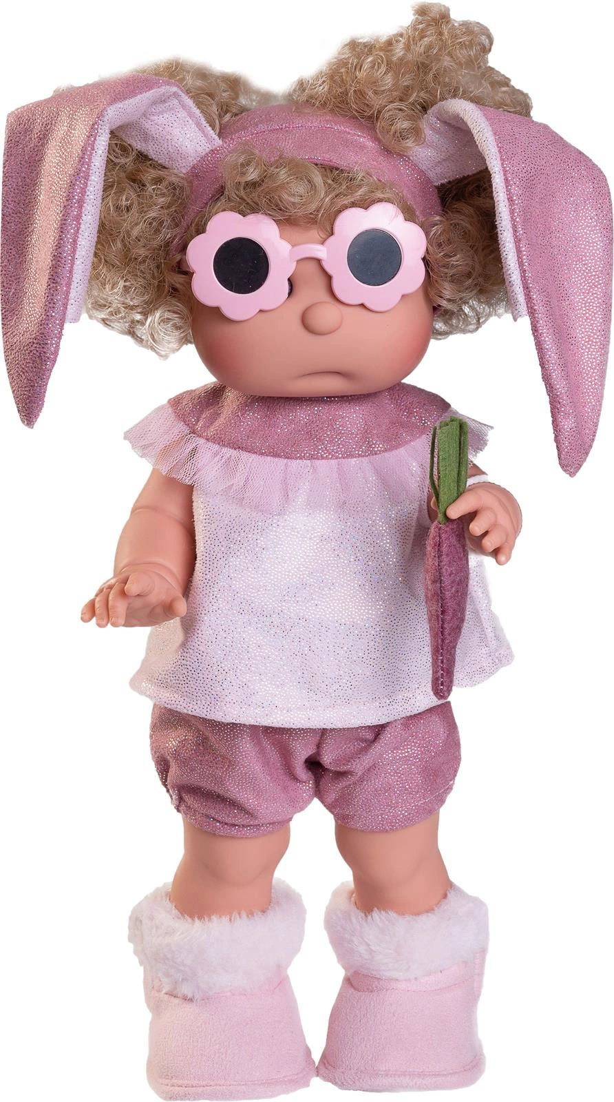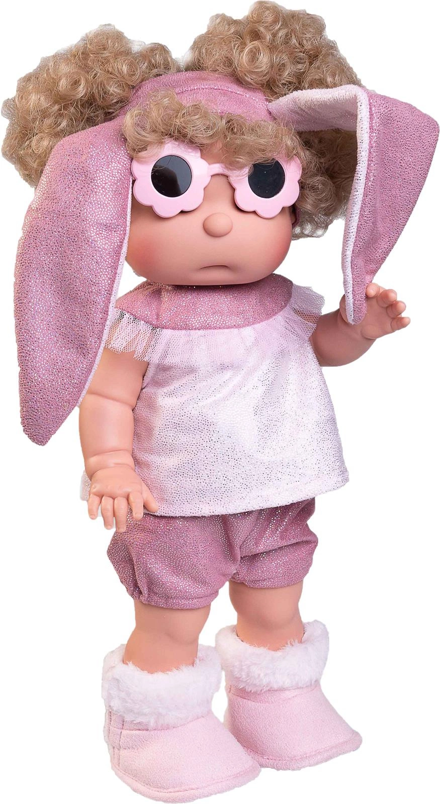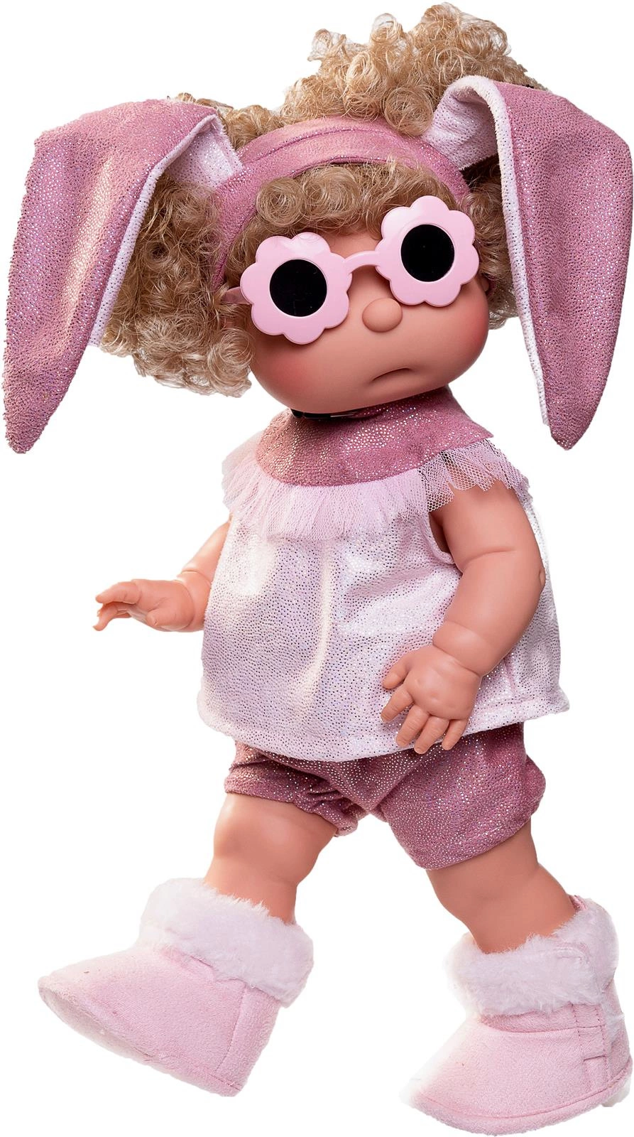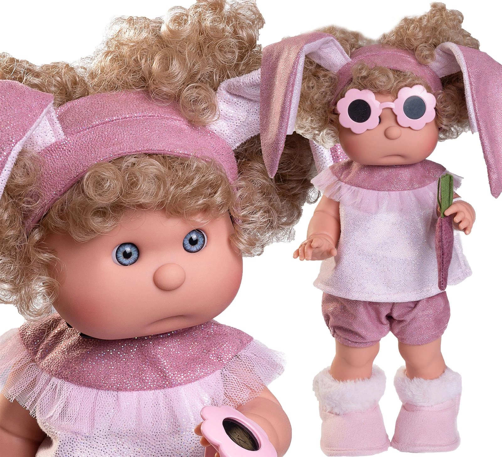 Zachwyca słodka buzia z rumianymi policzkami, okrągłym noskiem, niebieskimi oczkami i jasnoróżowymi usteczkami. Mięciutkie, kręcone blond włosy zostały zebrane za pomocą uroczej, lśniącej, różowej opaski z długimi, brokatowymi uszkami.