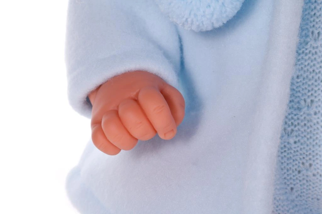 Noworodek ubrany jest w niebieskie body z dzianiny oraz polarowy płaszczyk z kapturem w tym samym kolorze. Kurtkę można zawiązać pod brodą na sznurek ozdobiony pomponami. Ubranie przyda się do otulenia lali szczególnie w chłodniejsze dni. Stroju wyjątkowego uroku dodaje różowa czapka z małymi pomponami na środku oraz polarowe skarpetki. Teraz nasza pociecha może rozbierać i ubierać lalę bez końca, co pomoże przy nabraniu wprawy w codziennym obowiązku przebierania.