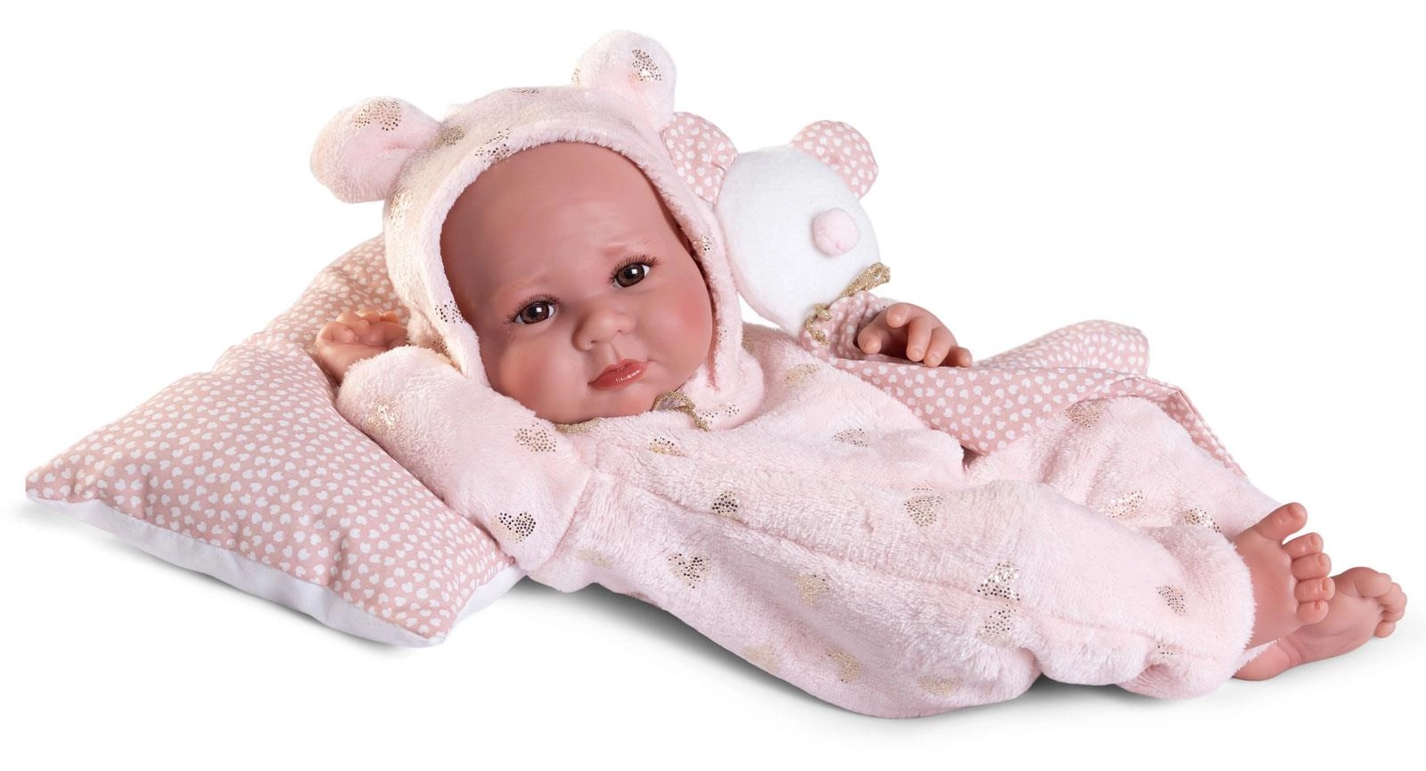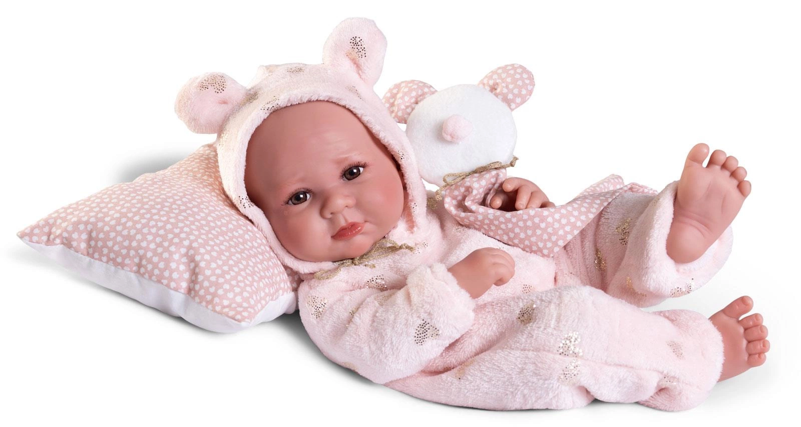 Jedyna w swoim rodzaju, oryginalna lalka hiszpańska Luca 50416 została w całości wykonana w Hiszpanii. Atrakcyjności zabawce dodaje miękka, brzoskwiniowa poduszka w serduszka oraz przytulanka w pasującej do outfitu bobasa kolorystyce. Oryginalne, designerskie opakowanie z wieczkiem może spełniać rolę opakowania prezentowego, a następnie łóżeczka dla bobasa. Lalki hiszpańskie Antonio Juan posiadają wszystkie wymagane certyfikaty bezpieczeństwa i nadają wyjątkowego charakteru każdej kolekcji zabawek.