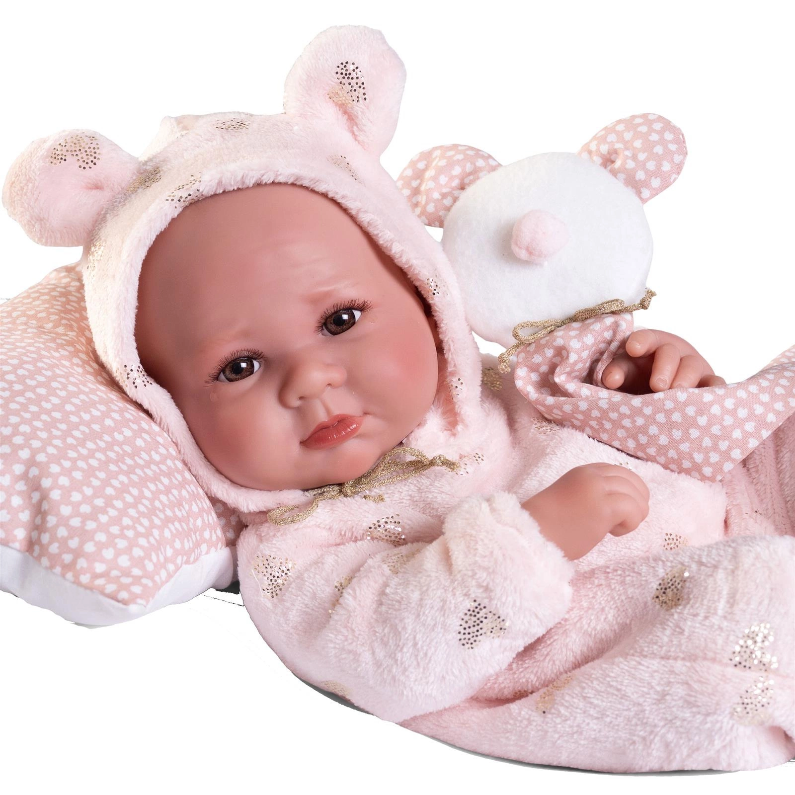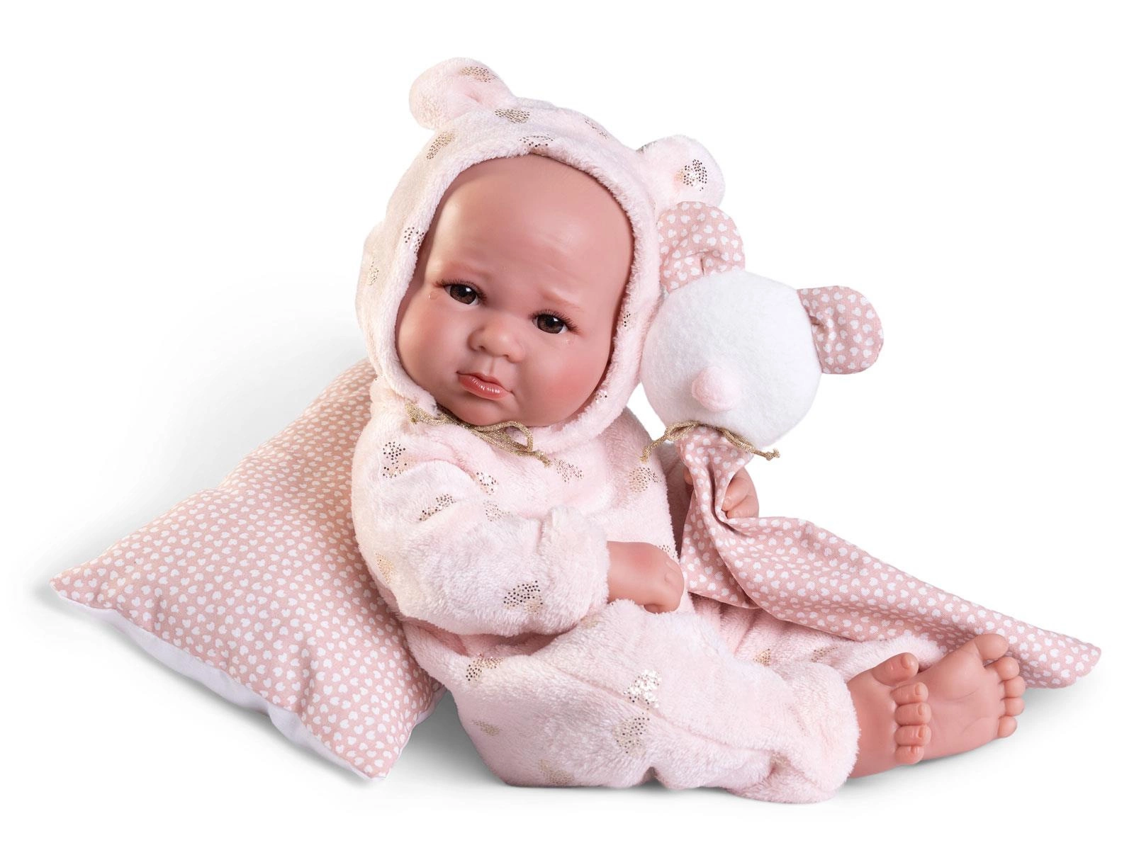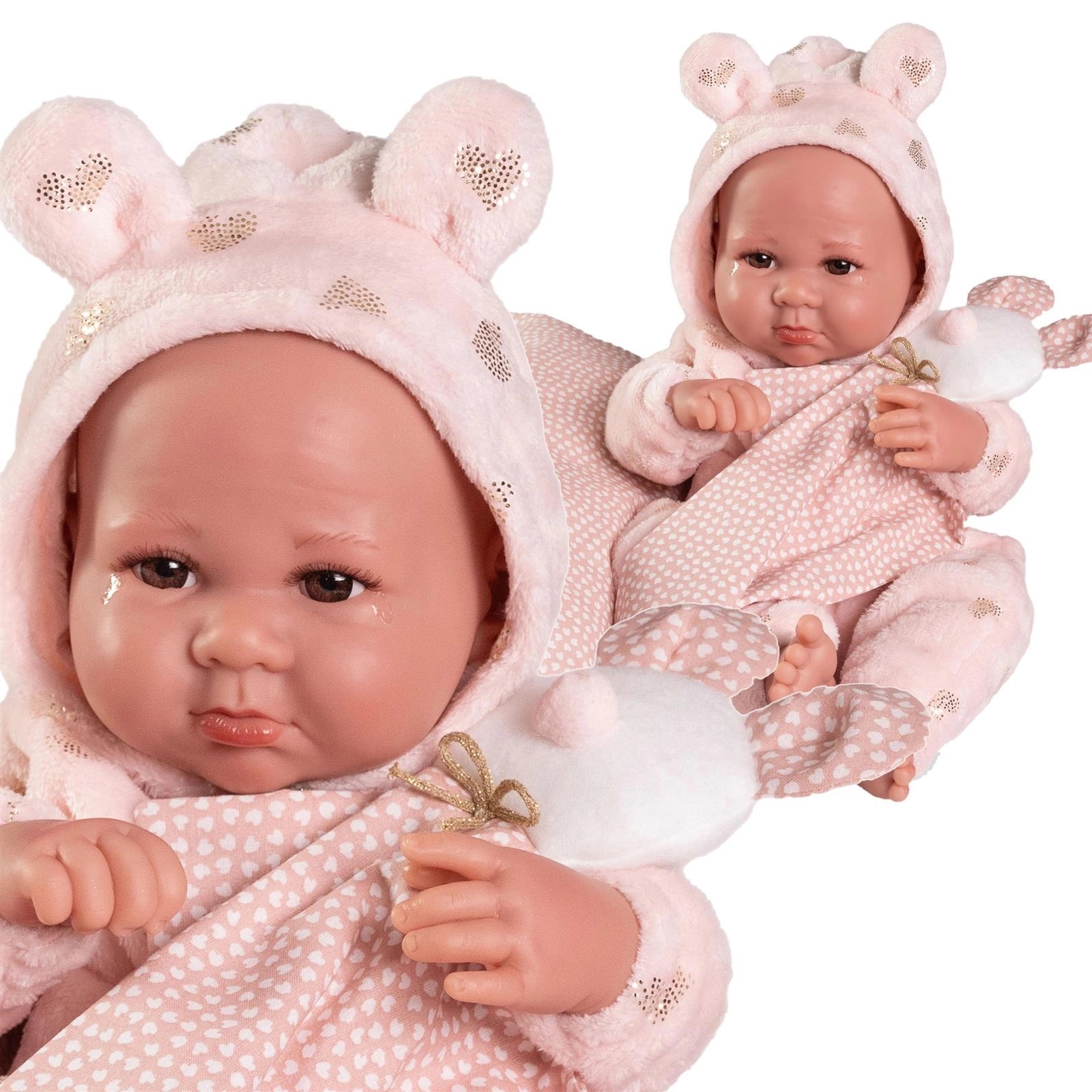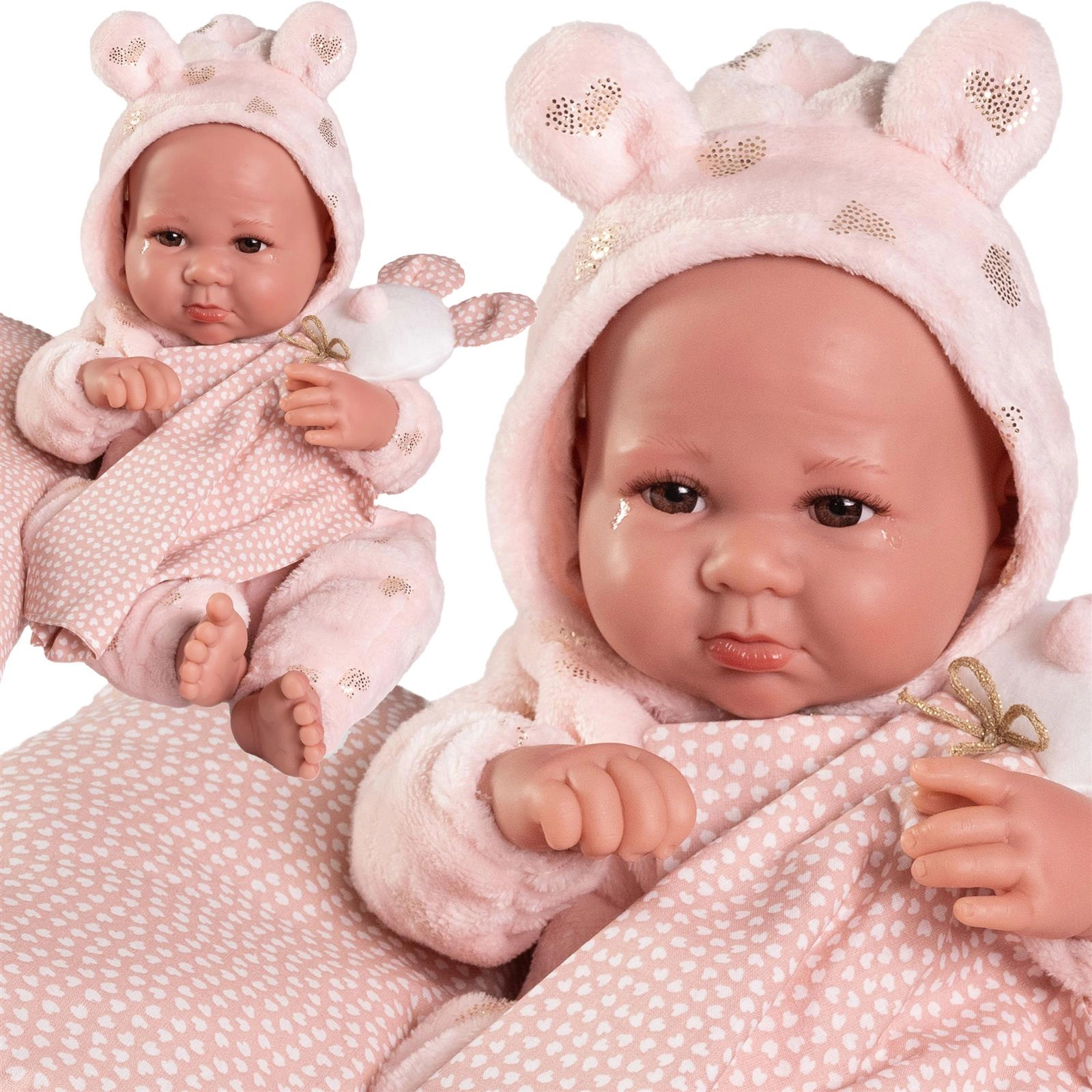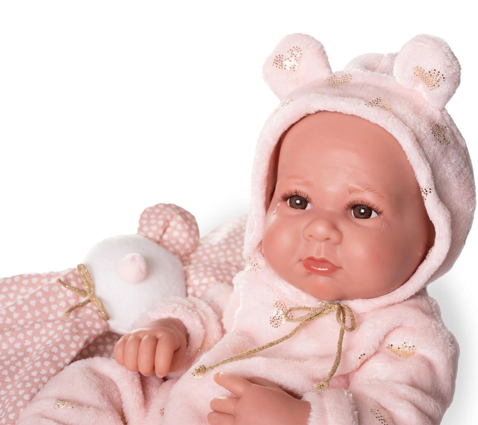 Bobasa można posadzić lub położyć w różnych pozycjach dzięki ruchomym kończynom i głowie. Świetnie nadaje się też do zabawy w kąpieli. Dzięki zastosowaniu praktycznego zapięcia na rzep, ubranko z łatwością można zdjąć. Pluszowa, brzoskwiniowa piżamka z kapturem ozdobiono uroczymi serduszkami, lśniącymi złotym brokatem. Kaptur ze słodkimi uszkami jest wiązany błyszczącym sznureczkiem.