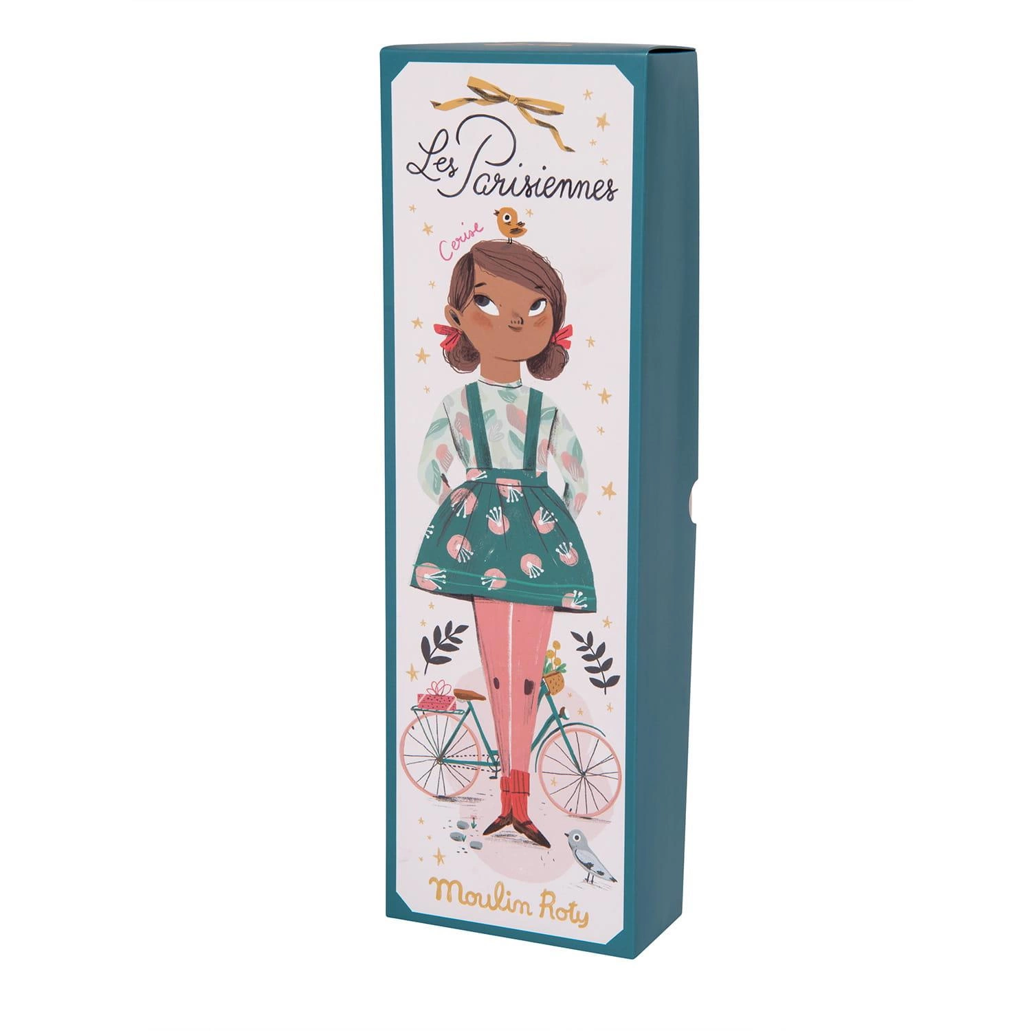Lalka CERISE czarodziejka elegancji, od francuskiej marki Moulin Roty. Wykonana z niezwykłą dbałością o szczegóły przy użyciu najlepszych materiałów bezpiecznych dla zdrowia malucha. Doskonała przyjaciółka dla każdej modnej dziewczynki .  Wzorzysta bluzka, plisowana spódniczka na ramiączkach i kokardki we włosach  lalki CERISE emanują kolorami. Lalka jest zapakowana w pudełko z pięknym nadrukie, zilustrowane przez projektantkę Lucille Michieli
