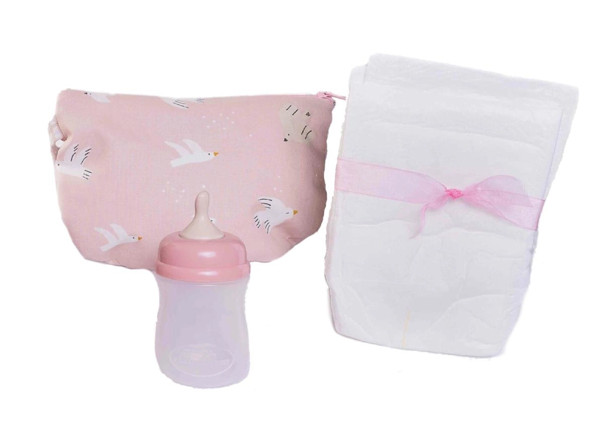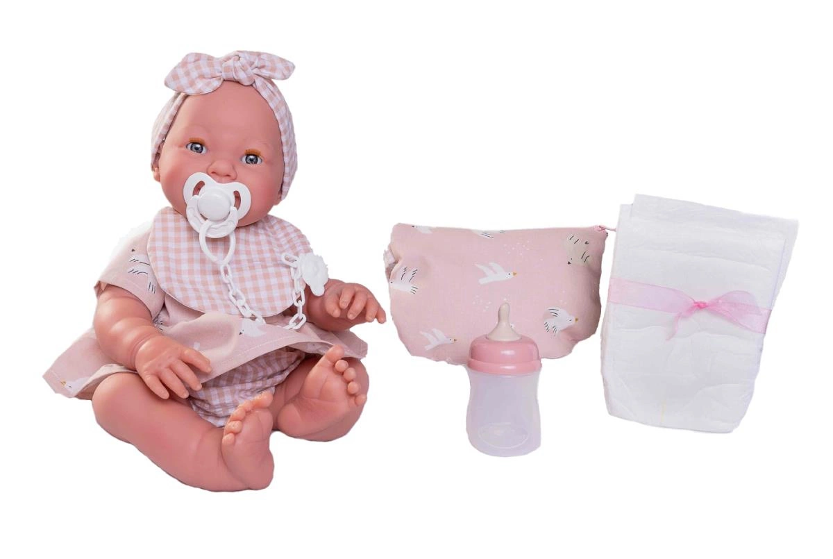 Noworodek ma na sobie różową sukienkę na krótki rękaw i kraciaste spodenki. Kreacja ozdobiona grafiką w ptaszki posiada zapięcie na rzep umieszczoną z tyłu ubranka. Stylizację uzupełnia opaska z kokardą i śliniaczek. Oba dodatki o wzorze w biało-różową kratę. Siusiający model wyposażono również w butelkę, którą można napełnić wodą, smoczek na łańcuszku z zawieszką misia i pieluszkę do przewijania zmoczonego bobasa. Producent dołączył do lali kosmetyczkę na drobne rzeczy, aby mogła mieć zawsze przy sobie.
