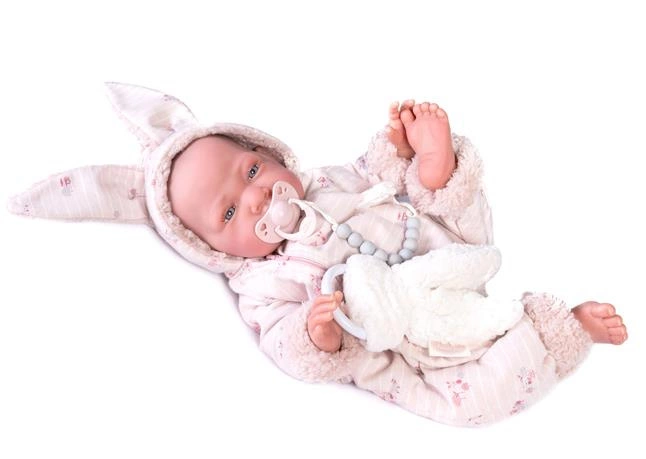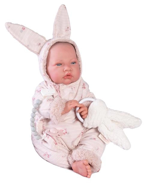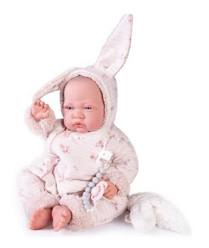 Słodki noworodek ma na sobie biały T-shirt i przytulny kombinezon z kapturem zakończonym uszami królika. Od środka ubranko wysłano futrzanym materiałem, a warstwę zewnętrzną stanowi różowy materiał ozdobiony wzorem w drobne paski i zwierzątka. Ubranko zapinane jest z przodu na zamek. Poza tym nosi pieluchę jak prawdziwe dziecko. Nie brakuje mu szczegółów w akcesoriach dlatego zawsze przy sobie ma smoczek i gryzak. Całą stylizację dziewczynki uszyto z wysokiej jakości tkanin. Wraz z Rebornem dostarczany jest certyfikat autentyczności z unikalną numeracją, która gwarantuje jego wyłączność jako Reborn od Antonio Juan.