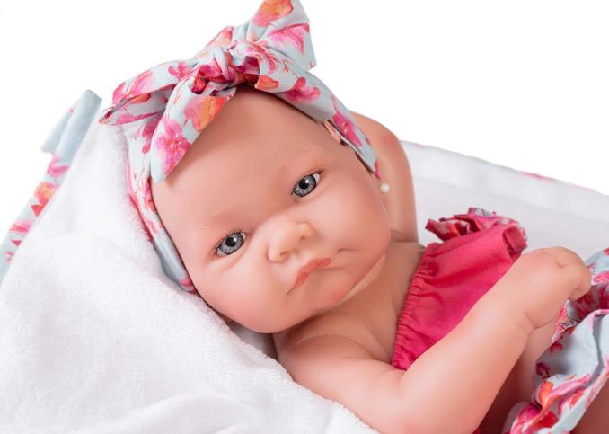 Dokładnie podkreślone rysy twarzy: zaróżowione policzki, zaznaczony podbródek, szeroki nosek z marszczeniem oraz na jej ciele uwydatniono liczne fałdki i dołeczki występujące na kończynach sprawiają, że dziewczynka wygląda jak żywa. Dziewczynka ma drobne rączki oraz nóżki z idealnie zaznaczonymi liniami papilarnymi. Wszystkie te detale sprawiają, że bobas przypomina prawdziwego maluszka. Drobnej dziewczynki tułów oraz kończyny wykonano z niezwykle przyjemnego materiału jakim jest winyl. Z uwagi na użyty materiał laleczkę można bez problemu kąpać, jednak czynność ta powinna odbyć się pod czujnym okiem rodziców z uwzględnieniem wszystkich zasad bezpieczeństwa. Nica ma dokładnie zaznaczoną płeć oraz pępek i jest to dziewczynka. Nica ma ruchome rączki, nóżki oraz główkę, dzięki czemu w łatwy sposób przybiera różne pozycje. Co więcej dziewczynka potrafi nawet samodzielnie siedzieć. Winylowa dziewczynka uwielbia gdy się nią opiekujesz, troszczysz czy przytulasz w przyjemnym kocyku. Czy jest coś bardziej uroczego niż dziecko? Wszechświat noworodków stworzony, by towarzyszyć maluchom w odkrywaniu świata. Nierozłączni towarzysze długich zabaw, którym nie brakuje szczegółów w ich delikatnych cechach oraz jakości ubrań i akcesoriów.