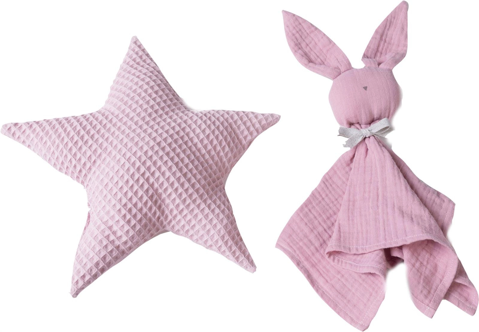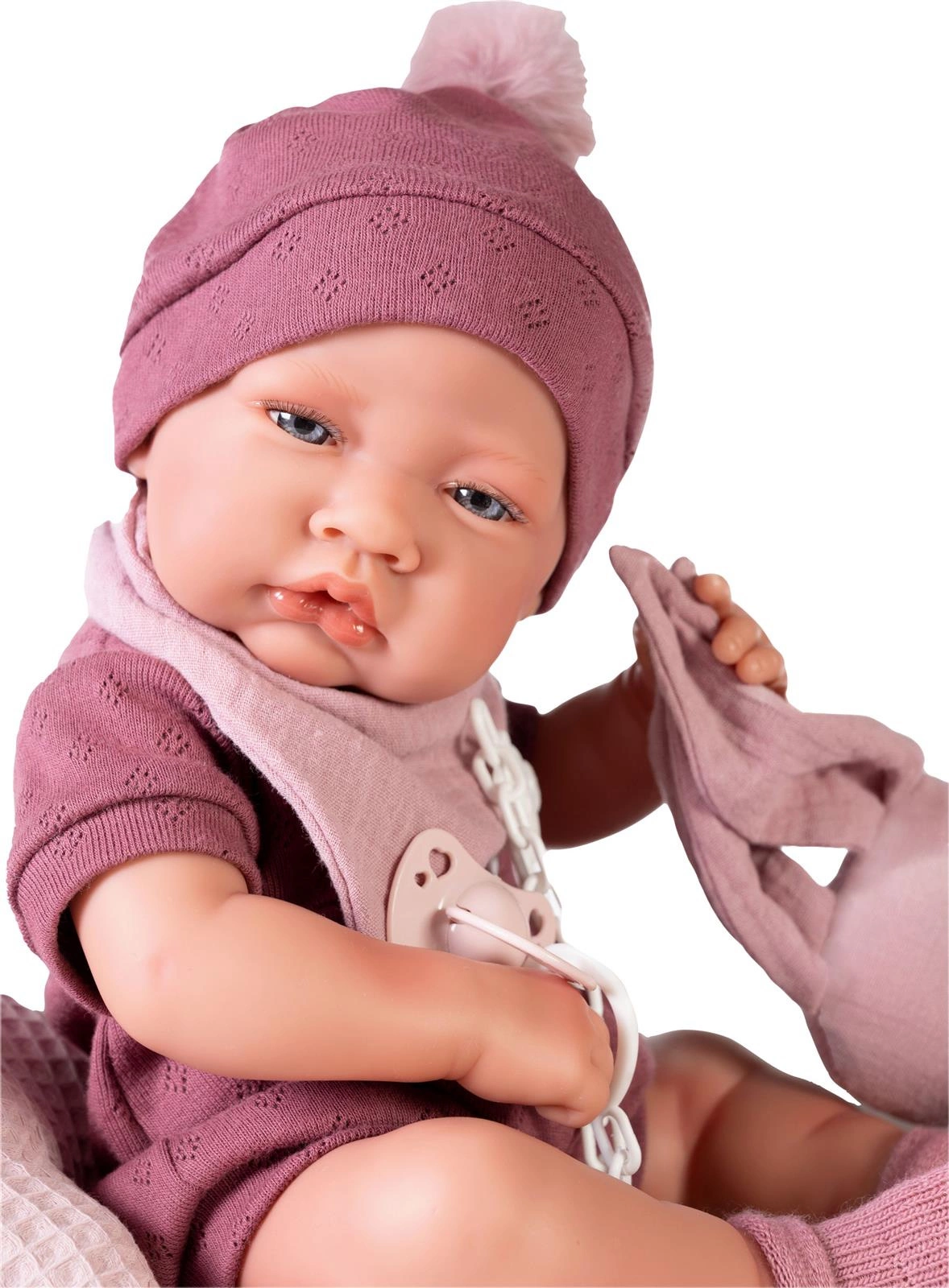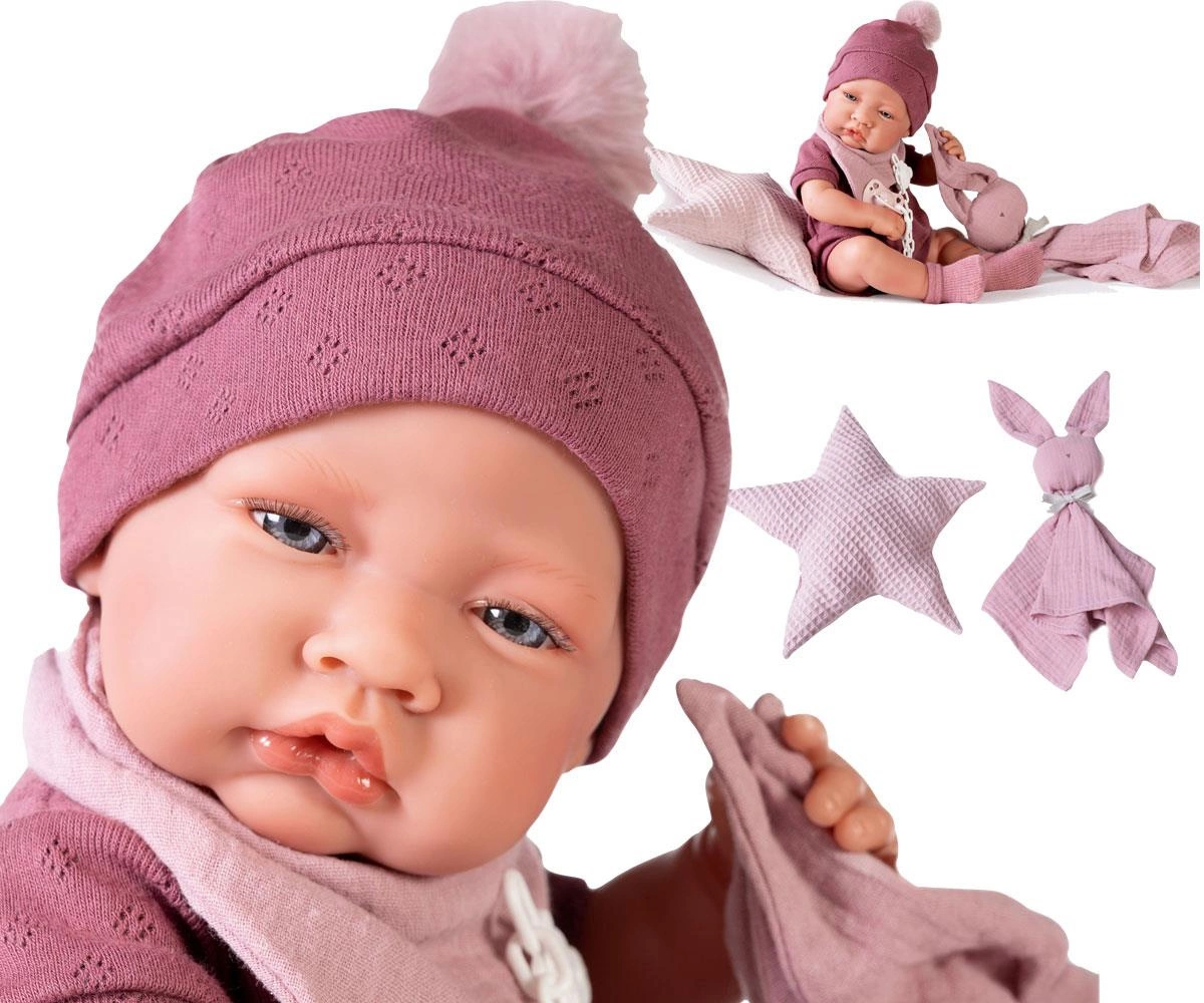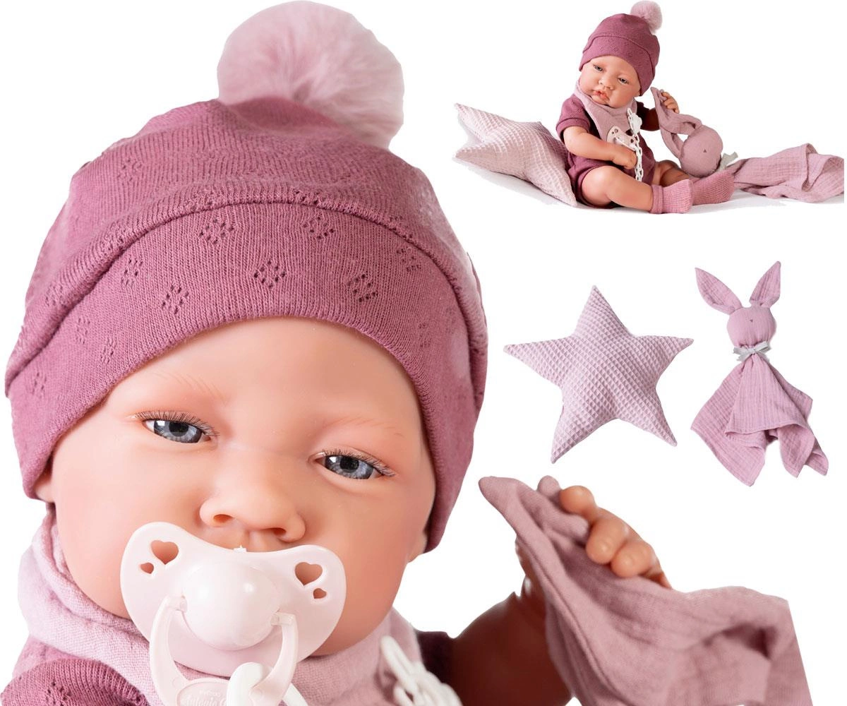 Pięknie wyglądający noworodek ma na sobie wrzosowe śpioszki oraz czapkę z pomponem. Uwielbia bawić się poduszką w kształcie gwiazdy, a kiedy robi się senny kładzie się na niej i przytula swojego króliczka dou dou. Komplet uzupełniono również o śliniaczek, skarpetki i smoczek z zawieszką misia. Całą stylizację wykonano z przyjemnego w dotyku tworzywa i z pewnością posłuży jak najdłużej.