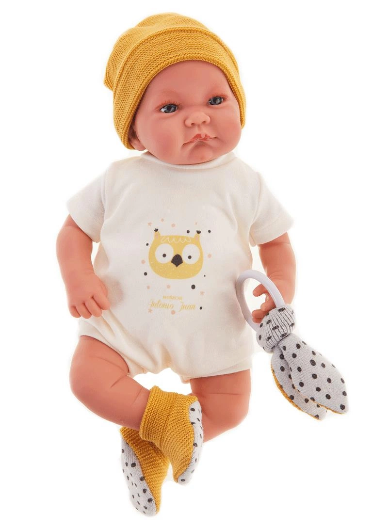 Asortyment marki Antonio Juan poszerzy kolejny uroczy bobas 33113. Chłopiec ma na imię Nico i jest to realnie odwzorowana laleczka, która swoim wyglądem przypomina prawdziwe niemowlę. Nico ma otwarte na stałe oczy, a ich oprawę podkreślą długie gęste rzęsy. Laleczka nie posiada włosów, jedynie na jej główce występują rzeźbienia imitujące włoski. Wizualnie bobas przypomina prawdziwego maluszka. Dodatkowo na główce laleczki założono miodową czapeczkę, a jego nóżki tulą ciepłe miodowe buciki. Oba te dodatki wykonano z tego samego materiału, jakim jest dzianina.