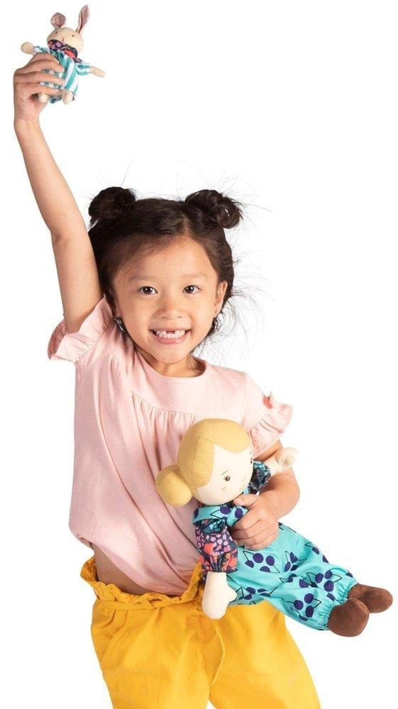 Lalka Olli to mięciutka wesoła dziewczynka o jasnych włosach, ma wbudowane body z małą kokardką, a ubrana jest w zdejmowany, wzorzysty dwuczęściowy strój oraz pluszowe buciki, które także można ściągać i zakładać. Idealna przytulanka, którą można śmiało wyprać w pralce, a później wysuszyć. Właśnie dlatego bez obaw można ją zabrać ze sobą wszędzie. Ollie ma przy sobie malutkiego, uroczego króliczka, ubranego w sukienkę w paski oraz kolorową apaszkę. Ta wesoła para przyjaciół z pewnością rozkocha każdą mniejszą i większą dziewczynkę.