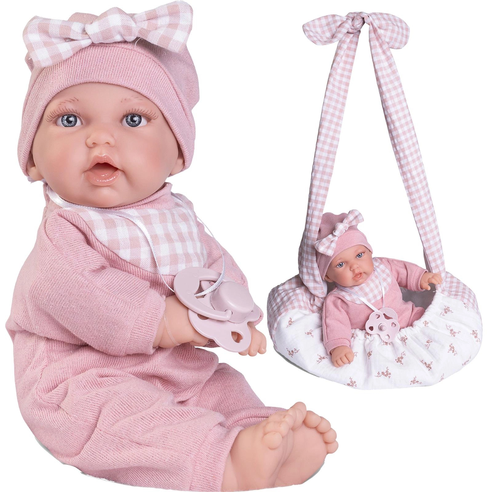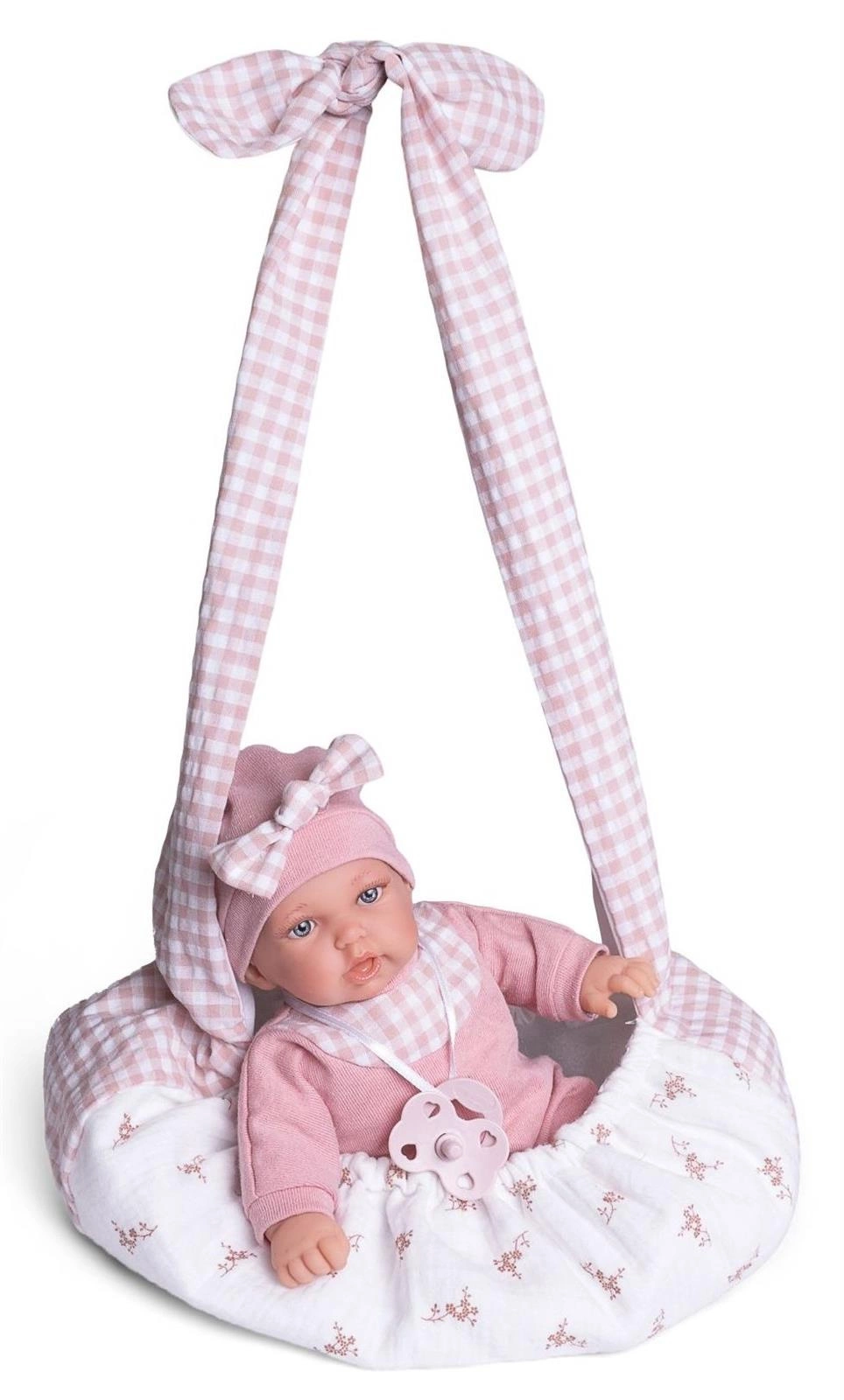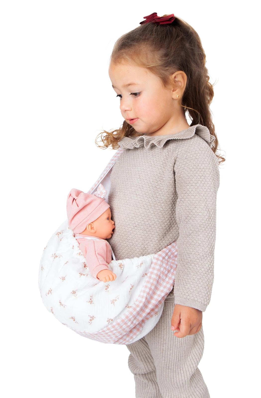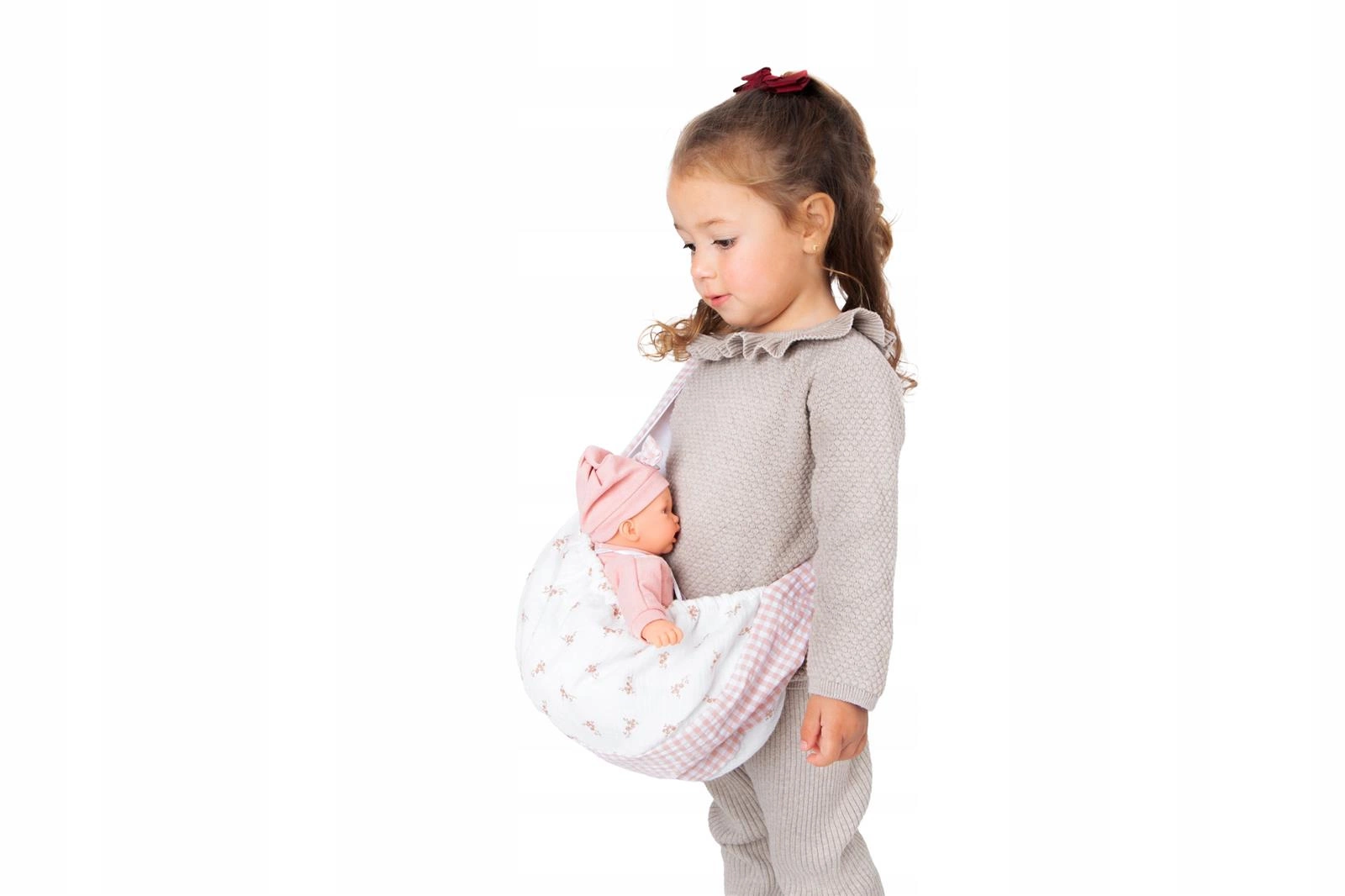 Lalka hiszpańska Petit 12441 jest ubrana w miękką, zapinaną na rzep piżamkę w kolorze pudrowego różu. Całość dopełnia słodka czapeczka z kokardką w kratkę oraz smoczek zawieszony na satynowej tasiemce. Wszystkie części garderoby można z łatwością zdjąć, a bobasa przebrać. Atrakcyjności zabawce dodaje bawełniana torebka w stylu chusty, zdobiona delikatnym roślinnym wzorem, z szeroką, wiązaną szarfą. Akcesorium zachęca do spacerów i aktywnego spędzania czasu na świeżym powietrzu. Luksusu dodaje firmowe kartonowe, solidne, pięknie zaprojektowane pudełko z wieczkiem. Może ono posłużyć jako opakowanie prezentowe a następnie łóżeczko dla bobasa.