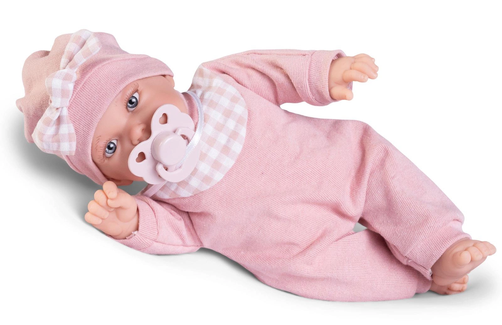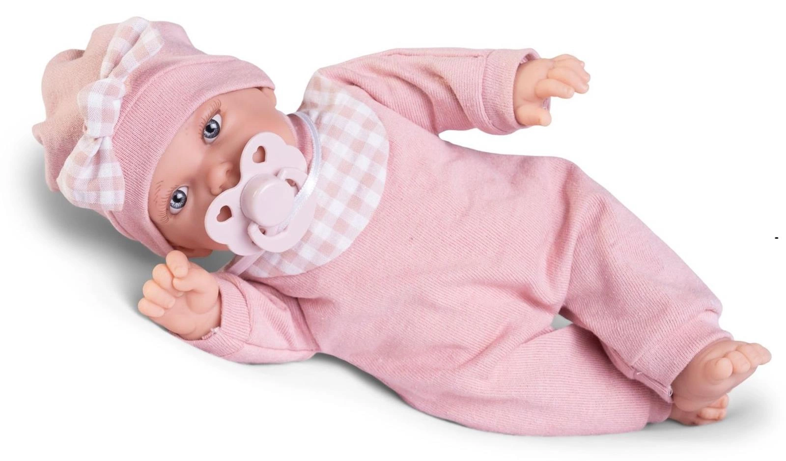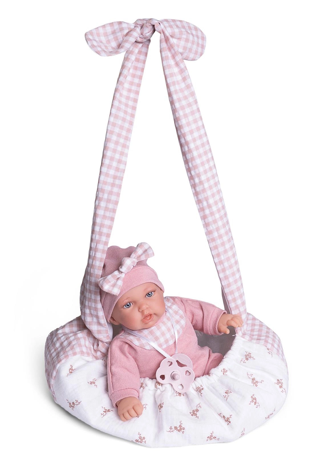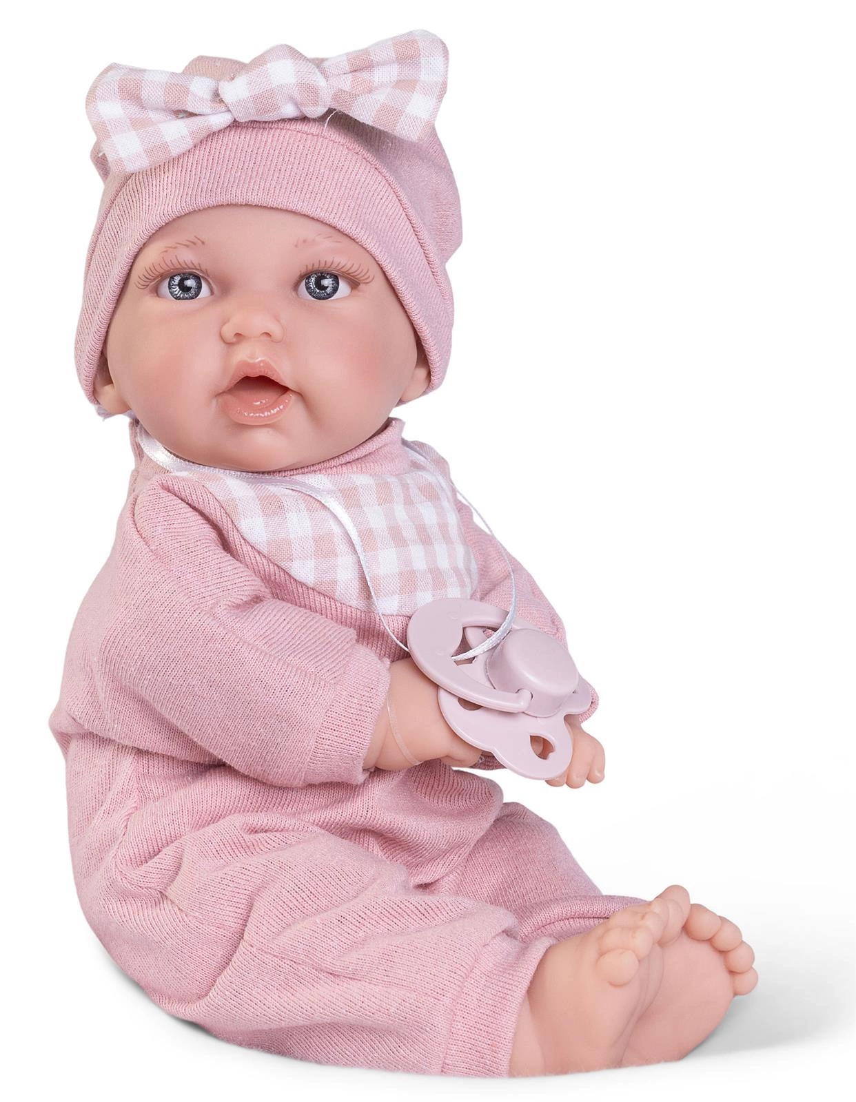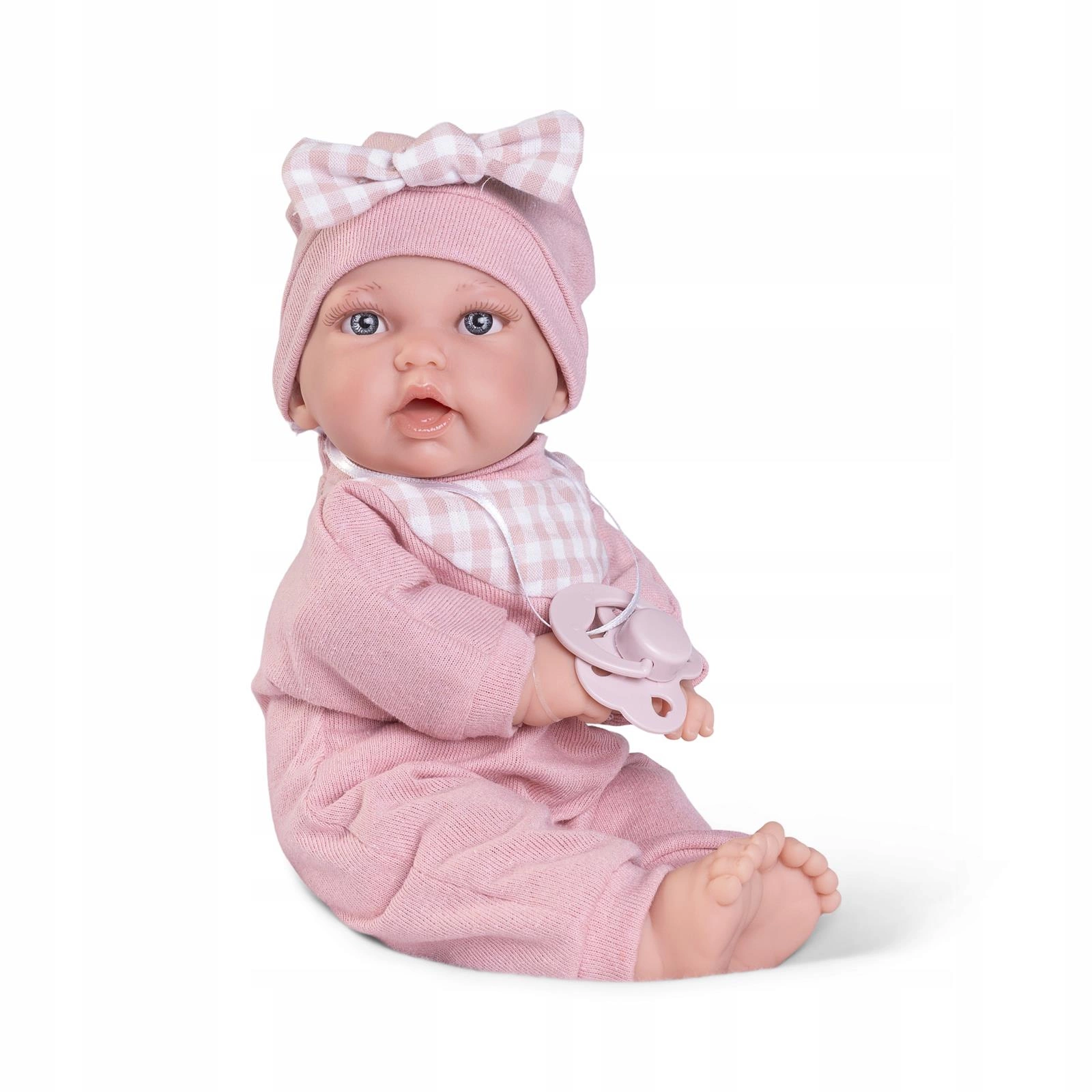 Lalka hiszpańska Petit 12441 jest ubrana w miękką, zapinaną na rzep piżamkę w kolorze pudrowego różu. Całość dopełnia słodka czapeczka z kokardką w kratkę oraz smoczek zawieszony na satynowej tasiemce. Wszystkie części garderoby można z łatwością zdjąć, a bobasa przebrać. Atrakcyjności zabawce dodaje bawełniana torebka w stylu chusty, zdobiona delikatnym roślinnym wzorem, z szeroką, wiązaną szarfą. Akcesorium zachęca do spacerów i aktywnego spędzania czasu na świeżym powietrzu. Luksusu dodaje firmowe kartonowe, solidne, pięknie zaprojektowane pudełko z wieczkiem. Może ono posłużyć jako opakowanie prezentowe a następnie łóżeczko dla bobasa.