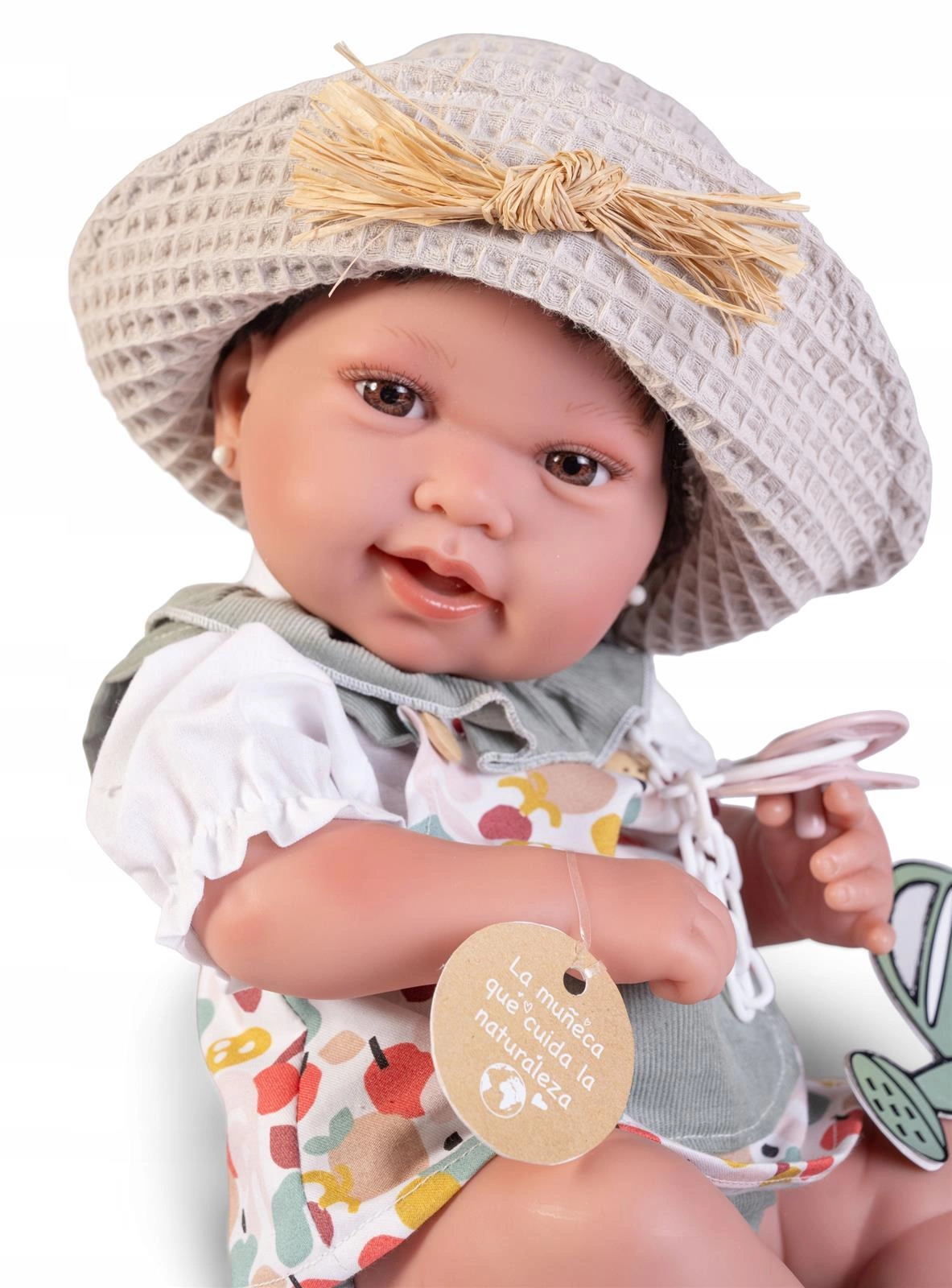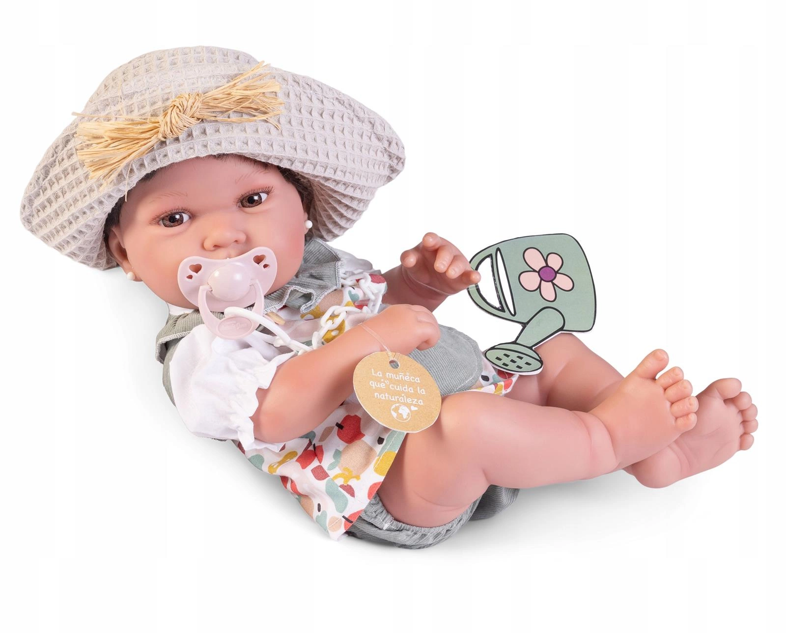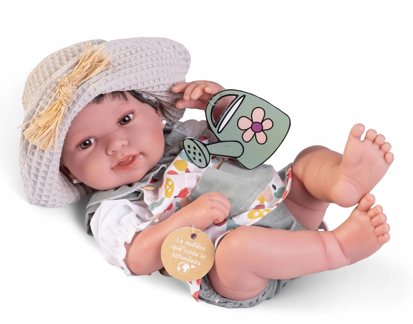 Piękna 42-cm ogrodniczka z krótkimi brązowymi włosami do czesania to oryginalna wersja bestsellerowego modelu 50036. Wykonany z miękkiego winylu bobas posiada pozostałość pępowiny i zaznaczoną płeć. Urzeka piękna, pogodna, autentycznie wyglądająca twarzyczka. Lalka hiszpańska renomowanej marki Antonio Juan zachwyca dopracowanymi detalami, takimi jak: długie rzęsy, ręcznie malowane brwi, usta i paznokcie, imitacja śliny w kąciku ust, czy też fałdki.