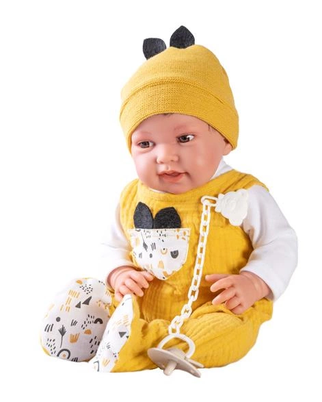 Urodę dzidziusia podkreśli modna stylizacja. Chłopiec ma na sobie ładny kombinezon w kolorze musztardowym i wsuwaną czapkę z czarnymi uszami. Całą stylizację wykańcza pasiasta poduszka zwieńczona pluszowymi pomponami. Przyjemna w dotyku podusia pozwoli otulić chłopca do snu. Dodatek sprawdzi się także jako wypełnienie wózka czy kołyski. Wszystkie ciuszki łączą się ze sobą kolorem i wzorem, co sprawia, że w całości zestaw prezentuje się doskonale. Ciuszki można zdjąć i przebierać chłopca bez końca. Natomiast kiedy Pipo jest śpiący możesz włożyć smoczek, a on wtedy spokojnie będzie leżakował na podusi. Dzięki funkcjonalności nasza pociecha nabiera wprawy przy przebieraniu i uczy się codziennych obowiązków, które nie raz na początku mogą sprawiać trudności.