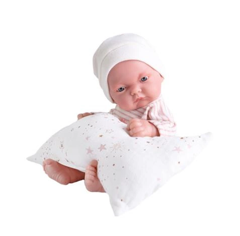 Hiszpański bobas ma duże niebieskie oczy, zaś na główce nie posiada włosków, jedynie występują rzeźbienia imitujące delikatne włoski, które wyglądem przypominają jak u prawdziwego noworodka. Bobas jest niewielki, dlatego sprawdzi się na wszelkie wyjścia oraz przyjęcia do rodziny czy wyjazd wakacyjny. Słodkie maleństwo od dziś będzie towarzyszyć gdziekolwiek pójdziesz. W asortymencie lalek Antonio jest wiele różnych Pitusów ile jest prawdziwych dzieci, więc znajdziesz odpowiedni model dla siebie w pięknych stylizacjach oraz uroczymi dodatkami.