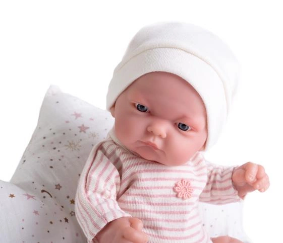 Ta mała postać wyróżnia się wielkim realizmem. Drobne ciało wykonane ze specjalnego i przyjemnego w dotyku winylu. Zastosowane tworzywo sprawia, że ułożysz niemowlę w wielu pozycjach w tym siedzącej, poprzez delikatne zgięcie nóżek. Autentycznie odwzorowany maluszek ma świetnie zaznaczone linie papilarne, fałdki, dołeczki, a nawet pępek jak u prawdziwego dziecka. Wszystko sprawia, że maluszek wygląda jak żywy!