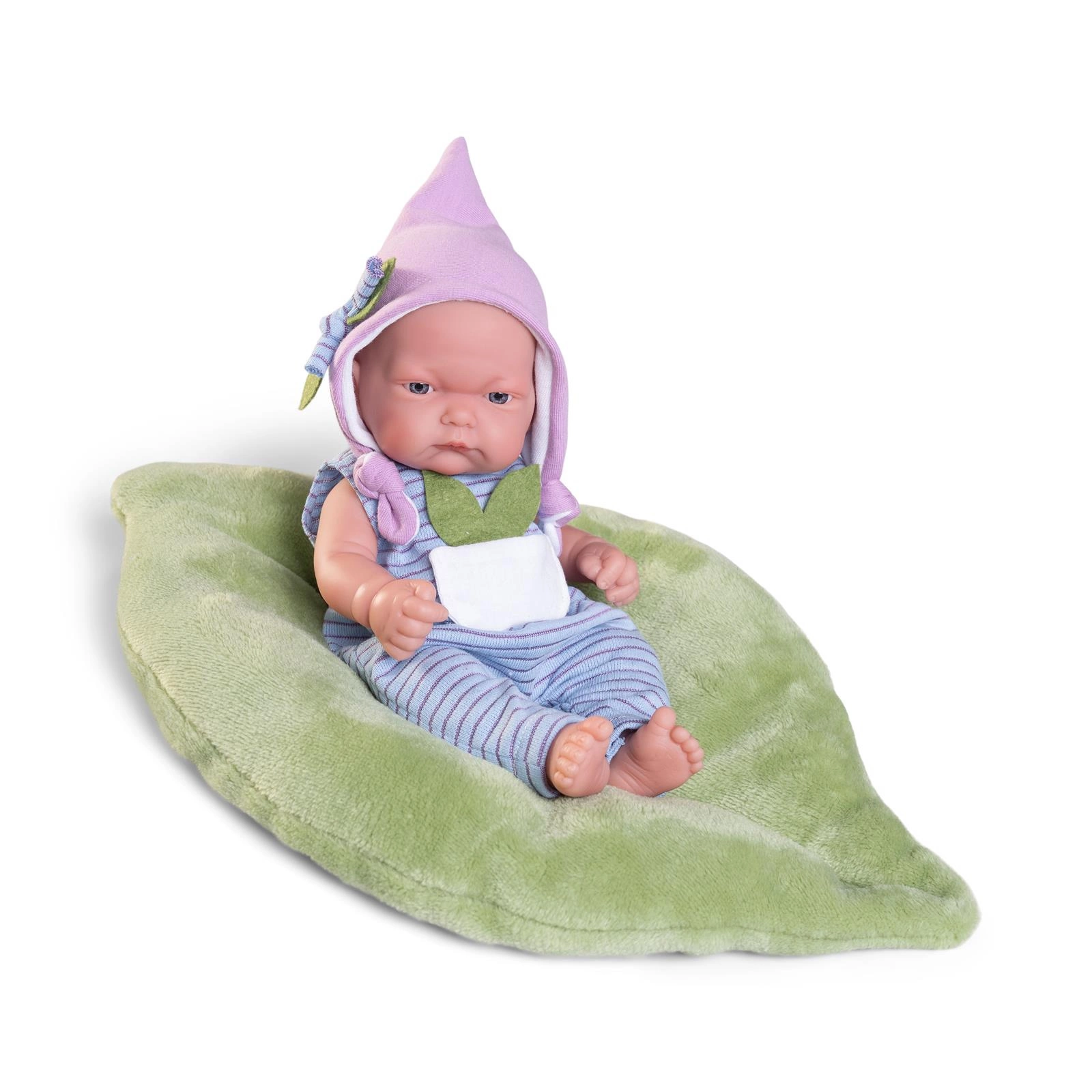 Wyglądający jak prawdziwe niemowlę, bobas z bestsellerowej serii Pitu posiada wyrzeźbione paznokcie i fałdki. Chłopiec ubrany jest w ręcznie szytą, lekką, bawełnianą piżamkę w kolorze niebieskim w wąskie poziome paseczki. Uroku dodaje słodka kieszonka oraz wiązana ozdobna czapeczka. Całość dopełnia oryginalnie zaprojektowana miękka pluszowa, zielona poduszka w kształcie liścia.
