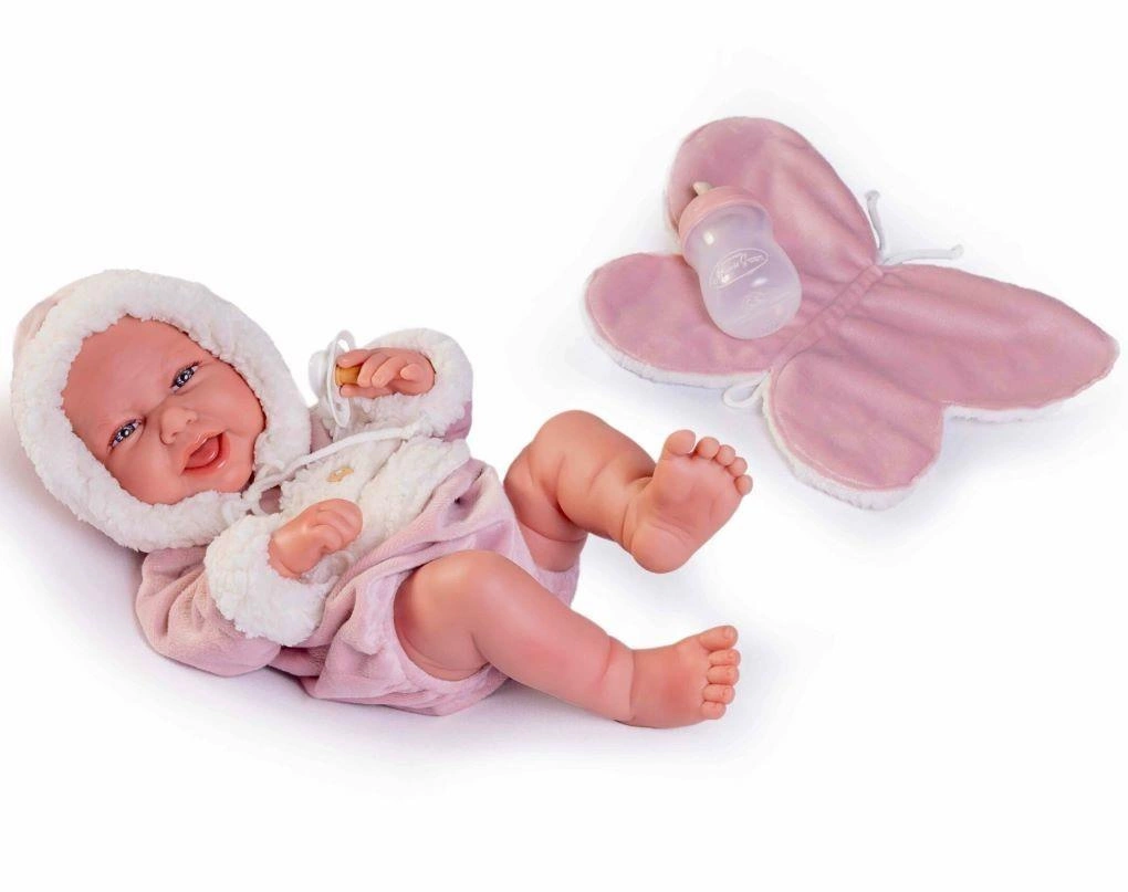 Lalka hiszpańska 50395 marki Antonio Juan to marzenie każdego dziecka, uwielbiającego zabawę w odgrywanie ról. Autentyczny wygląd pozwala z łatwością wcielić się w rolę troskliwego rodzica. Carla ubrana jest w oryginalnie zaprojektowany, ciepły jasnoróżowy rampers z wiązanym pod szyją kapturem. Zwracają uwagę wykończenia z owczej skóry. Strój z łatwością można zdjąć, a bobasa przebrać lub wykąpać.