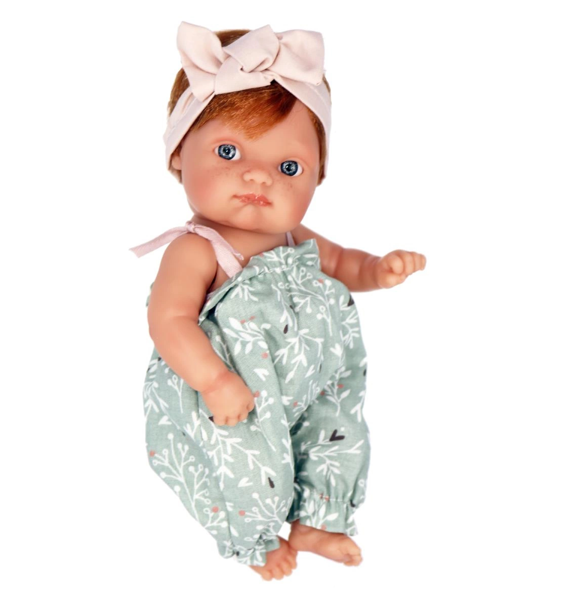 Dziewczynka ma na sobie miętowy kombinezon z grafiką w kolorowe listki. Ubranko na ramiączkach ma wszytą gumkę, aby odpowiednio przylegało do winylowej sylwetki. Komplet uzupełnia opaska na gumce z kokardą w kolorze pudrowego różu.