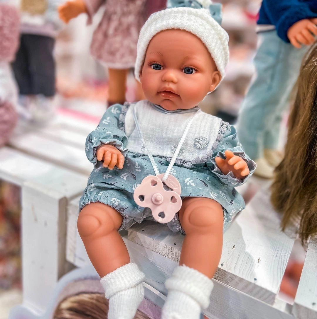 Lalka Recien Nacida Baby Toneta 70359 to kolejny słodki bobas z kolekcji lalek hiszpańskich. Jest to autentycznie odwzorowany bobas, który wyglądem przypomina prawdziwe niemowlę. Dziewczynka ma 34 cm wysokości i waży 408 g. Lalka o imieniu Toneta ma duże niebieskie oczy, które zostały otoczone długimi rzęsami, zaś jej brwi stanowią jedynie tylko zarys. Na główce laleczki zostały wyrzeźbione włoski przypominając niemowlęce. Laleczkę o niewielkich rozmiarach można wszędzie ze sobą zabrać.