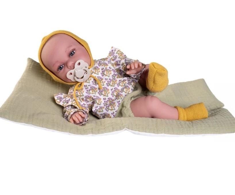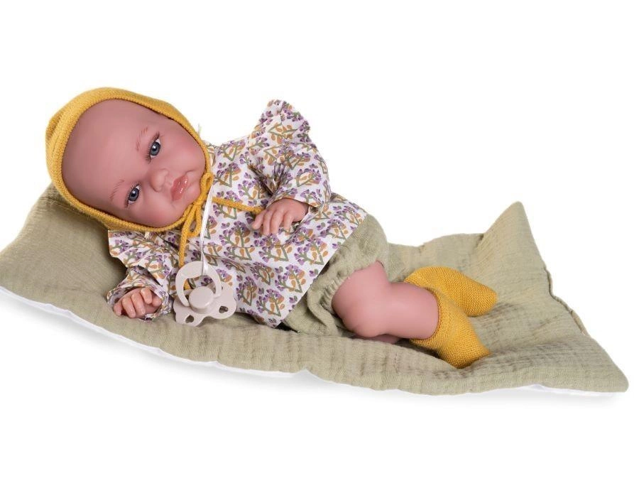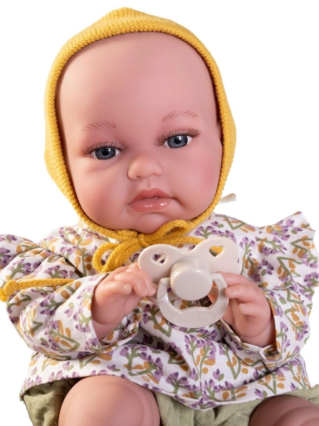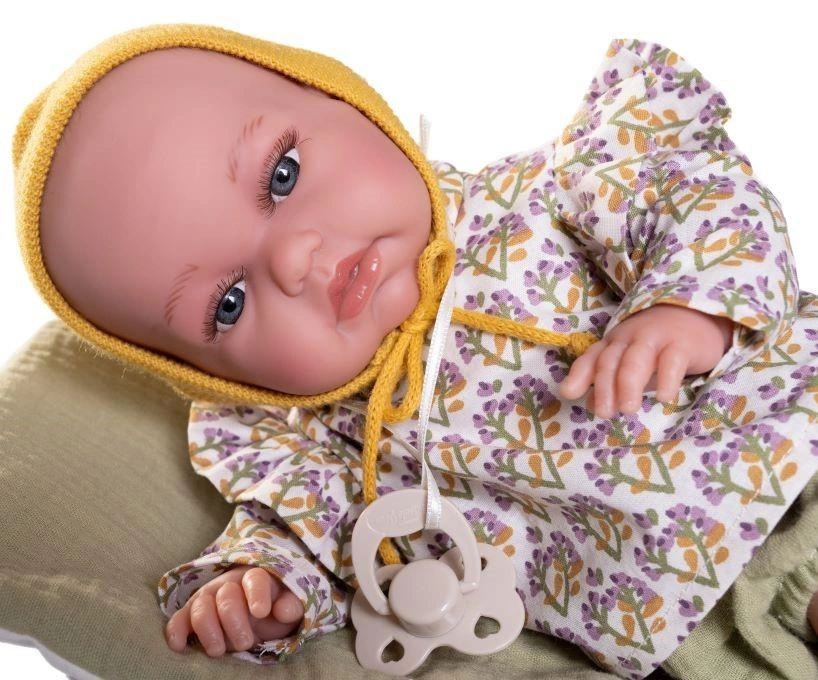 Realistycznie wyglądający bobas posiada wyrzeźbione włoski oraz delikatnie malowane brwi, paznokcie, linie papilarne i fałdki. Baby Toneta od marki Antonio Juan ubrana jest we wzorzystą bluzeczkę z falbankowymi dekoracjami, muślinowe zielone krótkie spodenki, wiązaną czapeczkę i skarpetki. Wszystkie elementy garderoby można łatwo zdjąć, a maleństwo przebrać w inny zestaw ubranek. W zestawie znajduje się także poduszka oraz smoczek na tasiemce satynowej.