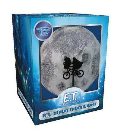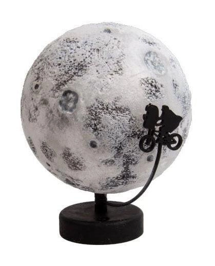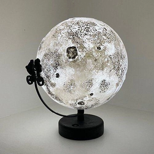 Lampka w kształcie księżyca z ruchomym ramieniem przedstawiającym E.T. na rowerze.