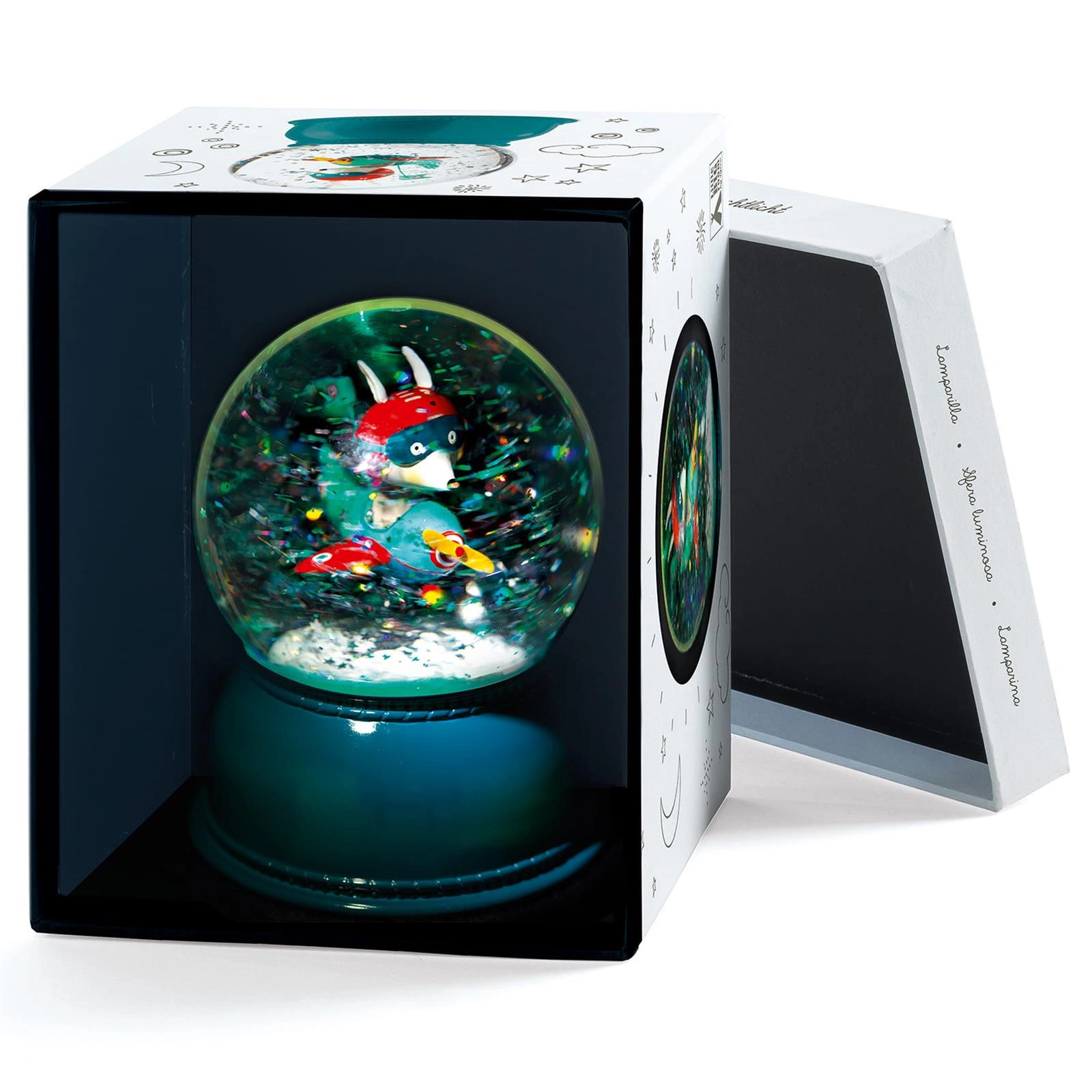 Dekoracyjna lampka nocna "Samolot" w formie kuli śnieżnej. Zasilana na baterie - 3 paluszki. Po włączeniu płatki zaczynają wirować , a lampka świeci tęczowym, opalizującym światłem.
