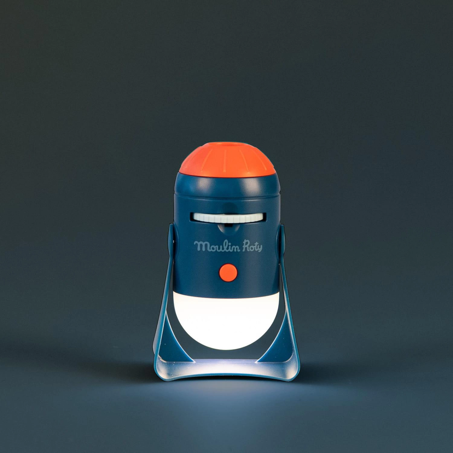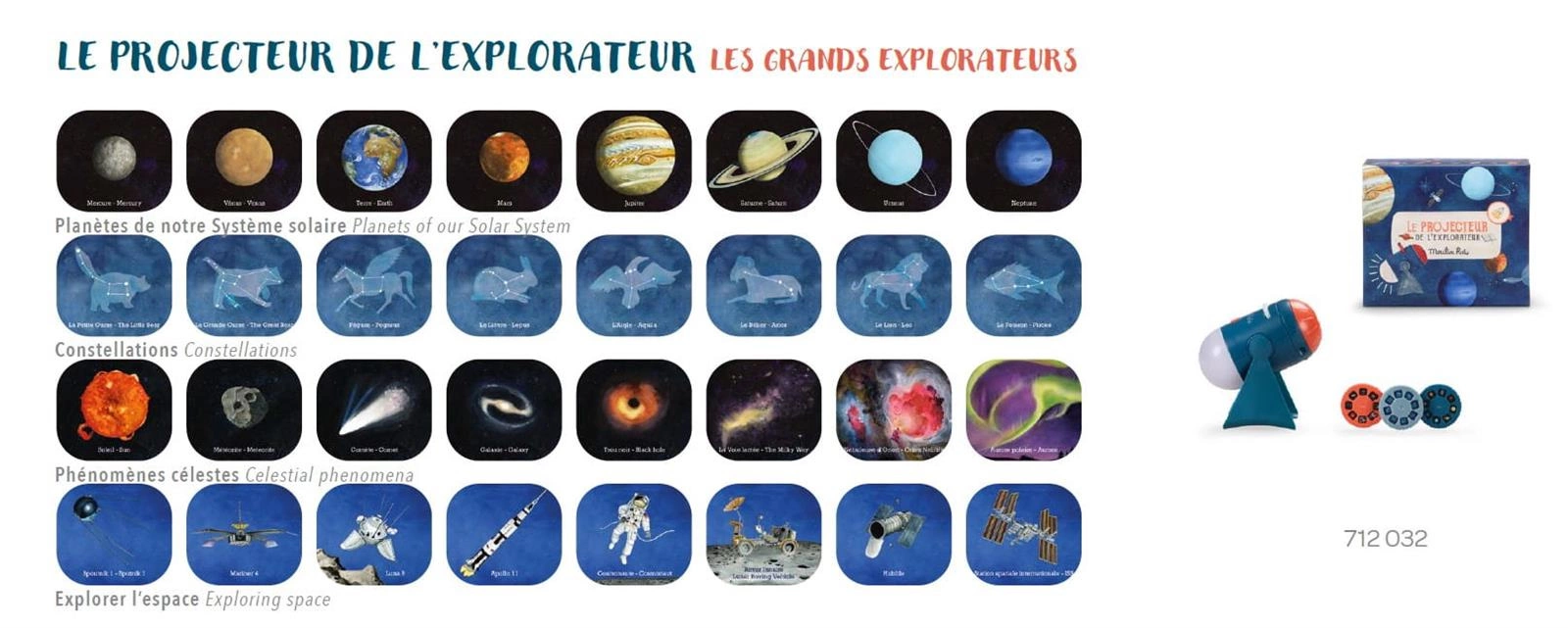 Projektor dwustronny 2 w 1 z kolekcji "Odkrywcy" francuskiej marki Moulin Roty. Z jednej strony projektor. Z drugiej strony lampka nocna LED z timerem 15 min. W zestawie są 4 krążki ze slajdami. Dzięki nim dziecko odkryje przestrzeń kosmiczną, konstelacje i planety.