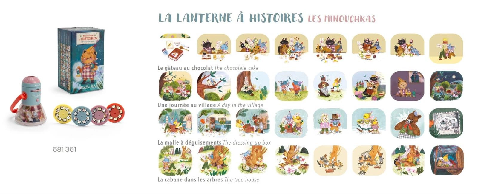 Kolekcja Les Minouchkas prezentuje lampkę projektor 3 w 1! Jedna zabawka, wiele możliwości użytku. Slajdy z bajkami, projektor cieni, lampka nocna... W zestawie 32 slajdy do wyświetlenia znajdujące się na 4 krążkach, które są kompatybilne z wszystkimi projektorkami od Moulin Roty.