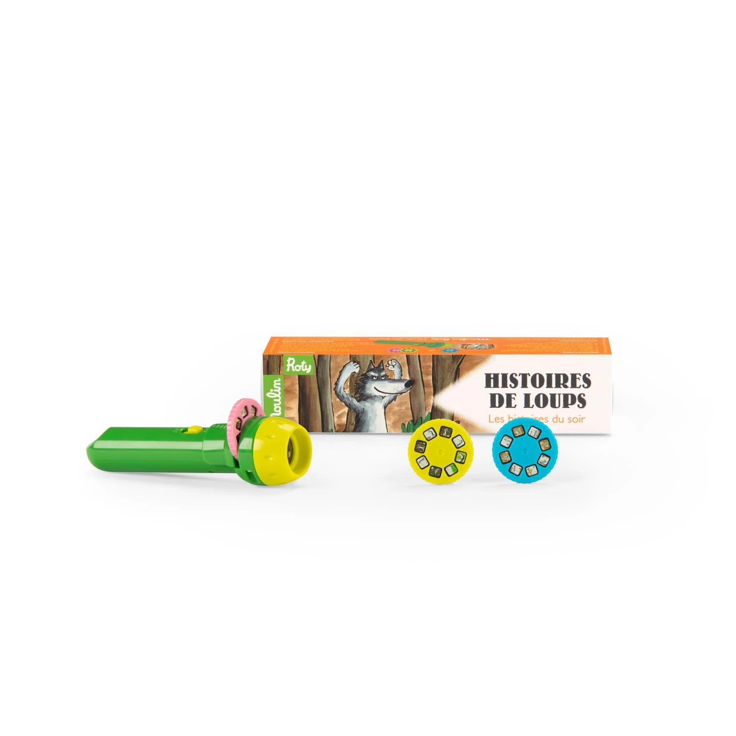 Lampka projektor i 3 krążki z bajkami przedstawiają historie z życia tego nietypowego wilka, który na pewno zdobędzie serca wszystkich dzieci.