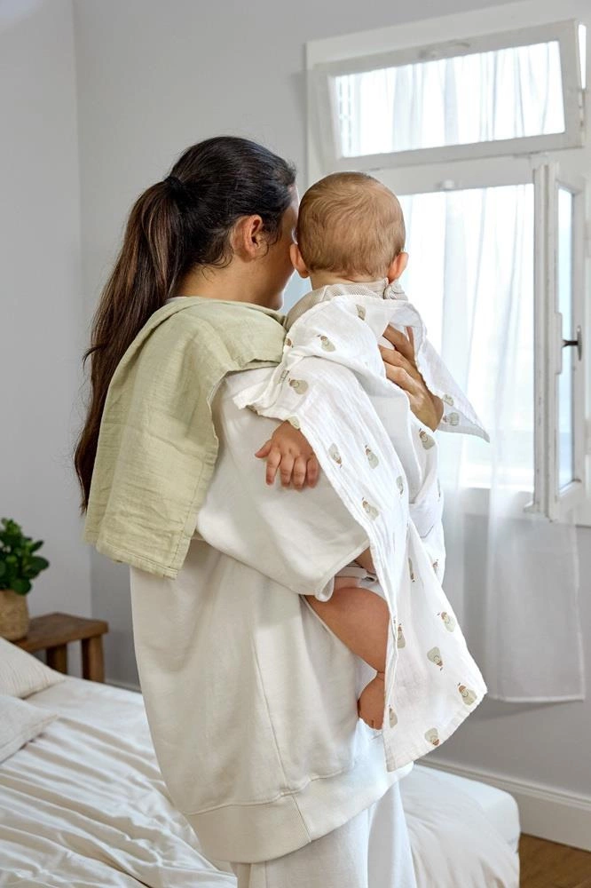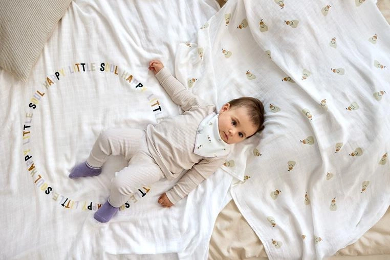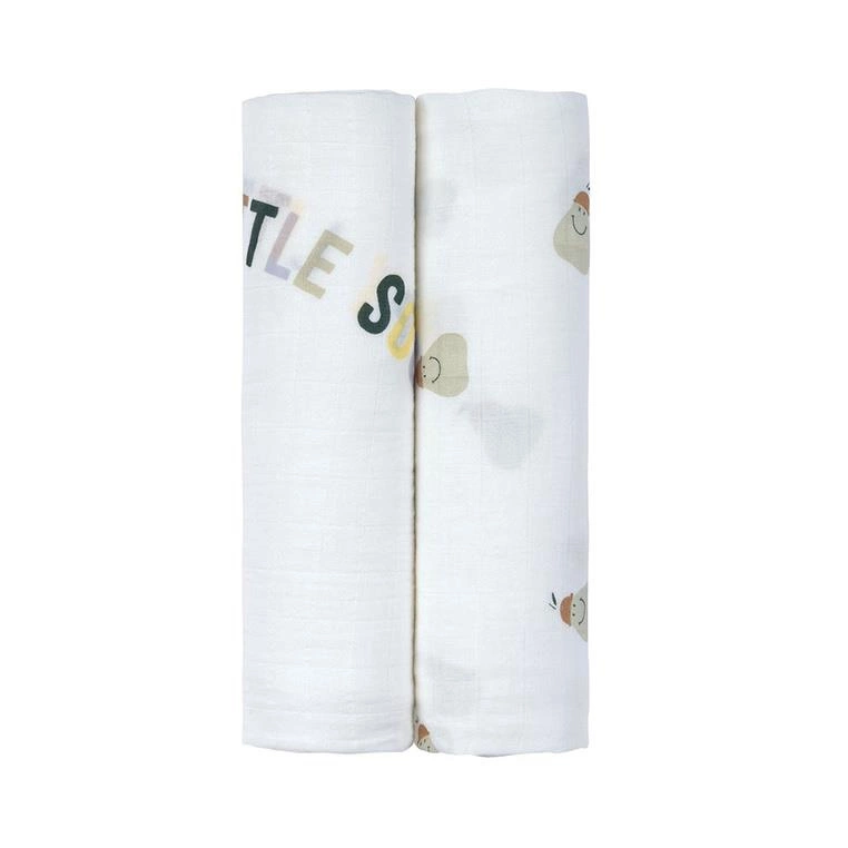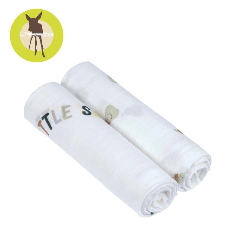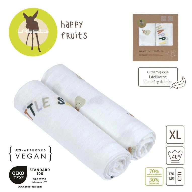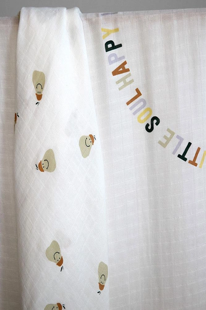 Komplet dwóch dużych wielofunkcyjnych bambusowych otulaczy niemieckiej marki LASSIG: jeden biały z motywem uśmiechniętej gruszki (multiprint), drugi biały z kolorowym napisem HAPPY LITTLE SOUL. Mogą być używane do owijania maluszka, jako pieluszka do odbijania po karmieniu, kocyk na lato, prześcieradełko czy kocyk do wózka, chusta do karmienia piersią, ochrona przed słońcem i na wszelkie inne sposoby według potrzeb. Są jednowarstwowe, przewiewne i delikatne dla skóry. Dzięki dużemu rozmiarowi 120x120 cm posłużą długo, jako otulacz czy kocyk nawet dla starszych dzieci. Dzięki kompletowi 2 sztuk rodzic ma potrzebny otulacz zawsze pod ręką.