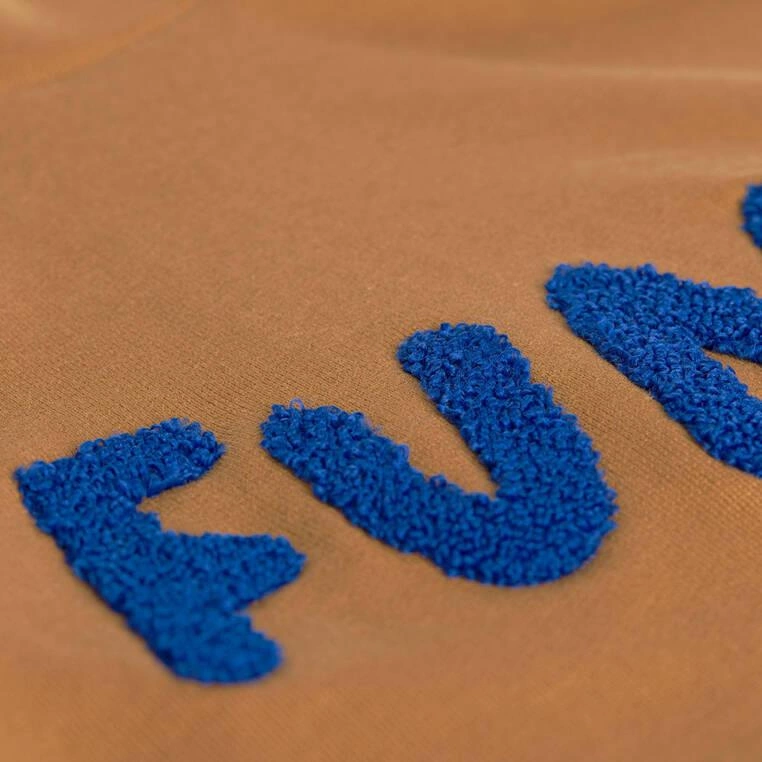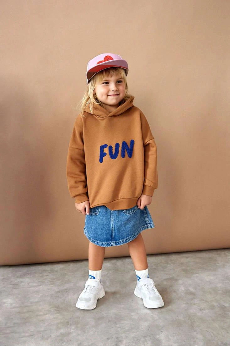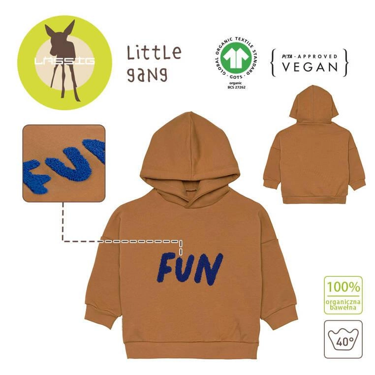 Modna i komfortowa bluza z kapturem FUN z kolekcji Little Gang niemieckiej marki LASSIG. Wykonana jest z niezwykle miękkiej, przyjemnej do noszenia, mięsistej bawełny organicznej z certyfikatem GOTS. Idealna do relaksu, zabawy i szaleństw. Gwarantuje swobodę ruchów i wygodę użytkowania. Ma intensywny karmelowy kolor i niebieską, teksturowaną aplikację na przodzie – napis FUN. Produkt jest częścią większej kolekcji. Możesz dobrać do niego inny w podobnym kolorze lub z podobnym motywem.