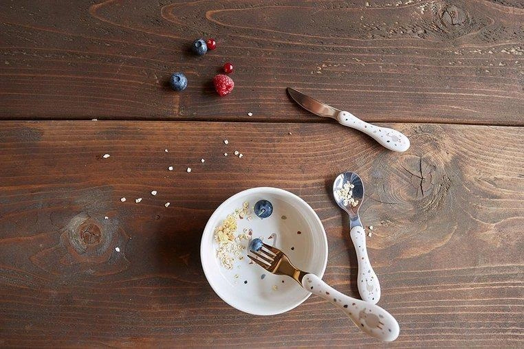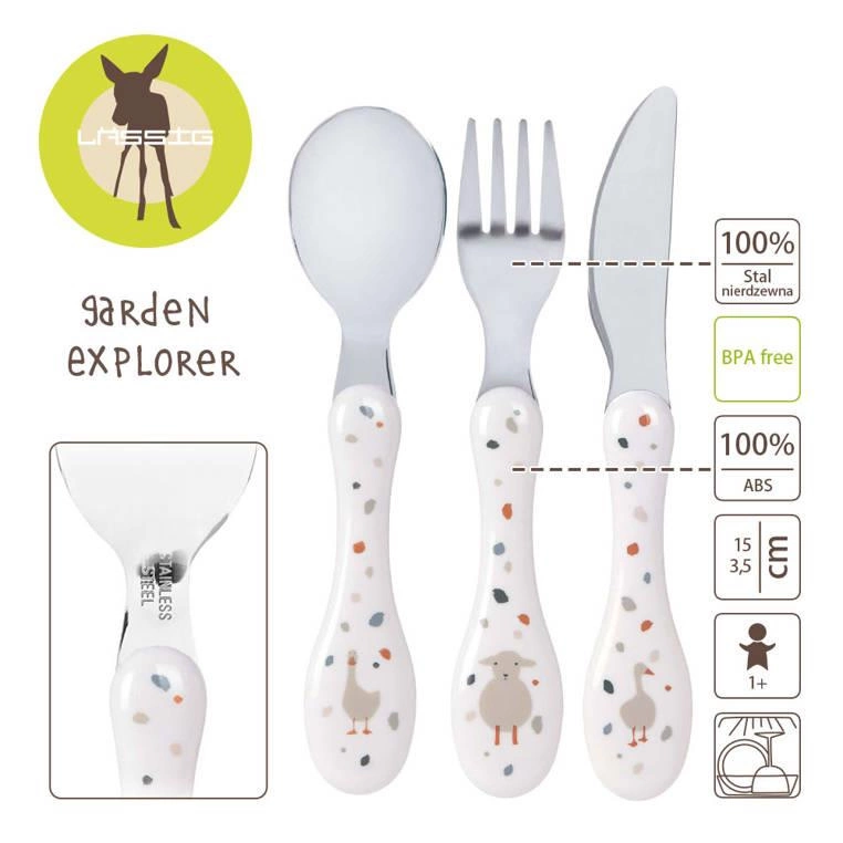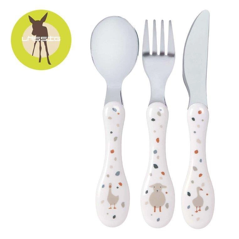 Zestaw sztućców ze stali nierdzewnej niemieckiej marki LASSIG, składający się z widelca, łyżki i noża. Sztućce są lekkie i mają specjalnie profilowane kształty, co ułatwia dzieciom nabieranie pożywienia. Są idealne do nauki samodzielnego jedzenia, a dzięki zaokrąglonym kształtom w pełni bezpieczne dla ust i delikatnych dziąseł maluchów. Rękojeść z tworzywa – w kolorze białym w kolorowe drobne plamki (jak lastriko) z beżowymi gąskami na łyże i nożu oraz beżową owieczką na widelczyku – również została zaprojektowana tak, by idealnie pasować do dziecięcej rączki. Dzięki przewężeniu łatwo ją złapać i utrzymać.