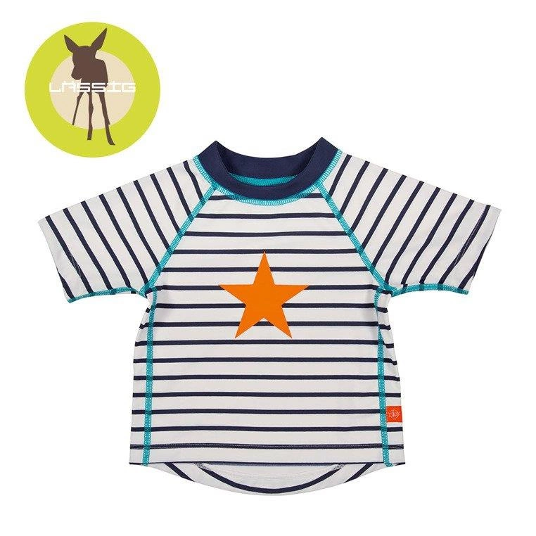 Koszulka typu T-shirt z krótkim rękawkiem wyposażona w ochronę UV. Znakomicie pasuje do pieluszek do pływania, z tej samej kolekcji LASSIG. Wykonana została z wyjątkowo delikatnej i elastycznej lycry i posiada filtr UV 50+. Dzięki tej ochronie przed słońcem beztroskie zabawy w wodzie są naprawdę bezpieczne. Oczywiście konieczne jest również użycie mleczka do opalania z filtrem.