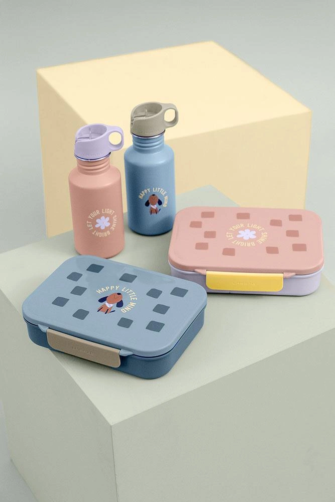 Lunchbox ma kolor rówowo-liliowy z grafiką białego kwiatka i napisem LET YOUR LIGHT SHINE BRIGHT oraz jasno żółty klips.