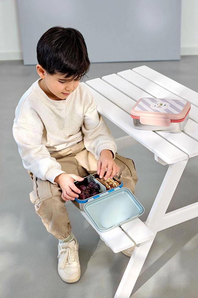 Solidne pudełko śniadaniowe ze stali nierdzewnej niemieckiej marki LASSIG przyda się nie tylko do szkoły, ale również podczas rodzinnych spacerów i wycieczek. Jest pojemne i posiada ruchomą, wyjmowaną przegrodę, dzięki której można je podzielić na dwie części, np. większą na kanapki, a mniejszą na owoce, krojone warzywa czy inne przekąski. Pudełko jest szczelne (ma silikonową uszczelkę) i solidne. Szeroki klips, na który jest zamykane, uniemożliwia samoczynne otwarcie. Lunchbox ma ergonomiczny kształt. Zmieści się nawet do małego plecaka.