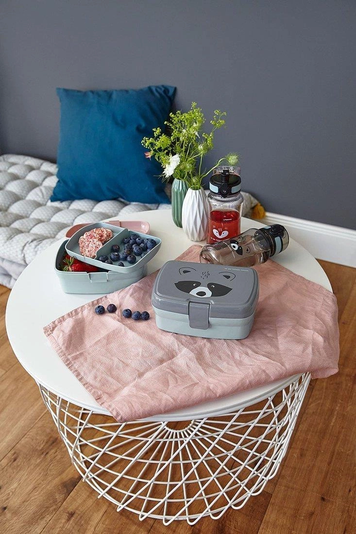 Piękny zestaw lunchowy niemieckiej marki LASSIG składa się z pojemnego lunchbox'a i butelki - bidonu. Przyda się do przedszkola lub szkoły, podczas spacerów, treningów i wycieczek. Pudełko jest sprytnie podzielone na część główną na dole, która pomieści np. kanapki oraz wyjmowany dwudzielny pojemnik na przekąski, np. pokrojone owoce czy wafelki, który można umieścić w górnej przestrzeni. Box można wygodnie zamknąć i otworzyć za pomocą szerokiego klipsa, który nie otworzy się samoistnie. Transparentna, jasnoszara butelka ma pojemność 460 ml i wykonana jest z Tritanu™ – nowoczesnego tworzywa BPA free. Nakrętka z wygodnym sportowym ustnikiem ma zintegrowaną przeźroczystą osłonę, zamykaną na klik, która zapobiega przypadkowemu rozlaniu się napoju oraz gwarantuje zachowanie higieny oraz antypoślizgowy silikonowy pas pośrodku, ułatwiający jej odkręcanie. Pojemniki są lekkie, solidne i szczelne. Mają ergonomiczny kształt i zmieszczą się nawet do małego plecaka czy torby. Jasno turkusowy lunchbox ma popielatą pokrywkę z grafiką słodkiego szopa. Ta sama mordka znajduje się także na bidonie.
