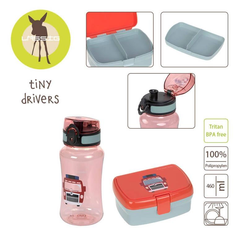 Lassig Zestaw na lunch Lunchbox + Tritanowa butelka - bidon 460 ml Tiny Drivers Wóz strażacki
