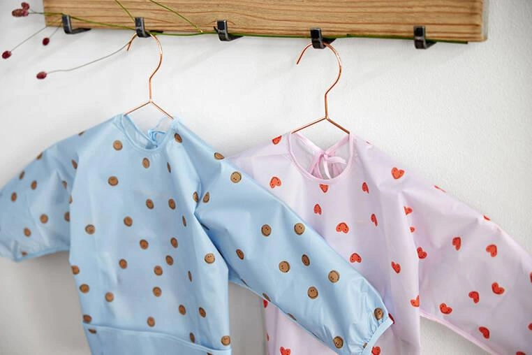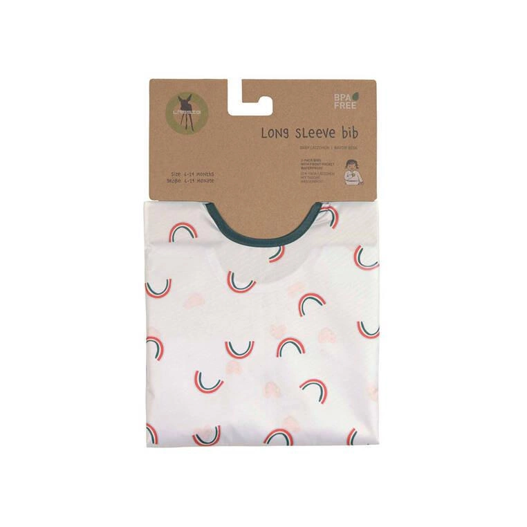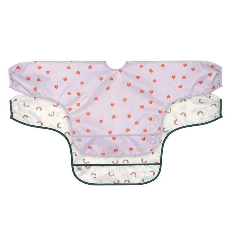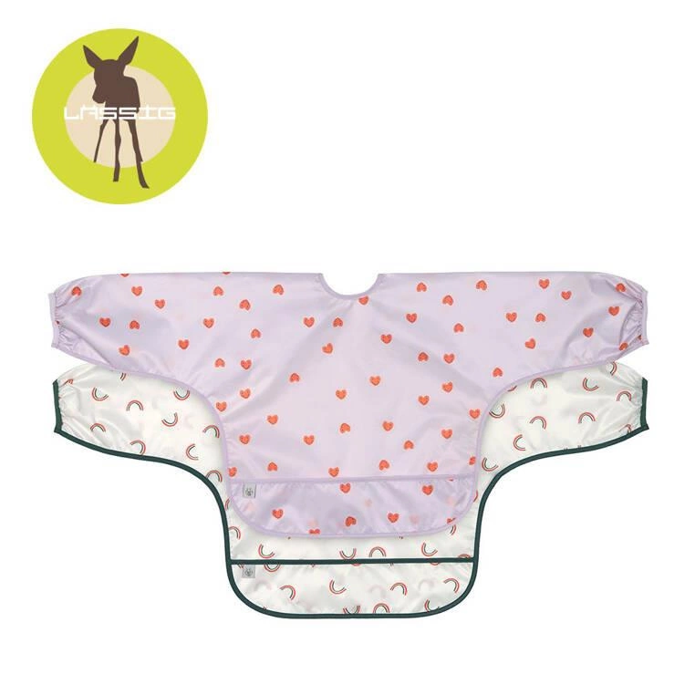 Zestaw dwóch praktycznych, łatwo zmywalnych śliniaków niemieckiej marki LASSIG. Są duże, wykonane z wodoodpornego tworzywa – jeden jasno lawendowy w czerwone uśmiechnięte serduszka, drugi jasny z ciemnozielonym obszyciem w multiprint z tęczą. Mają długie rękawy, miękką taśmę i wiązanie na tasiemki, a na dole funkcjonalną kieszonkę. Przeznaczone są dla dzieci od 6. do 24. miesiąca życia. Sprawdzą się nie tylko podczas karmienia malucha, ale też przy każdej twórczej aktywności dziecka: malowaniu, lepieniu z gliny, zabaw plasteliną czy prób samodzielnego przygotowania posiłku. Wygodne, nie krępują ruchów, dobrze przylegają do ubrań. Stanowią część większej kolekcji Happy Rascals. Możesz dobrać do nich inny produkt w tej samej gamie kolorystycznej lub z tym samym motywem.