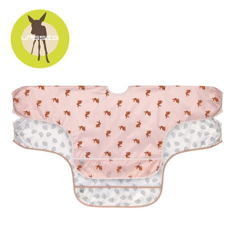 Zestaw dwóch praktycznych, łatwo zmywalnych śliniaków niemieckiej marki LASSIG. Są duże, wykonane z wodoodpornego tworzywa – jeden biały w drobne ciemne ciapki z jasnoróżowym obszyciem, drugi różowy w multiprint z zajączkiem w kolorze terakoty i z jaśniejszym obszyciem. Mają długie rękawy, miękką taśmę i wiązanie na tasiemki, a na dole funkcjonalną kieszonkę. Przeznaczone są dla dzieci od 6. do 24. miesiąca życia. Sprawdzą się nie tylko podczas karmienia malucha, ale też przy każdej twórczej aktywności dziecka: malowaniu, lepieniu z gliny, zabaw plasteliną czy prób samodzielnego przygotowania posiłku. Wygodne, nie krępują ruchów, dobrze przylegają do ubrań.
