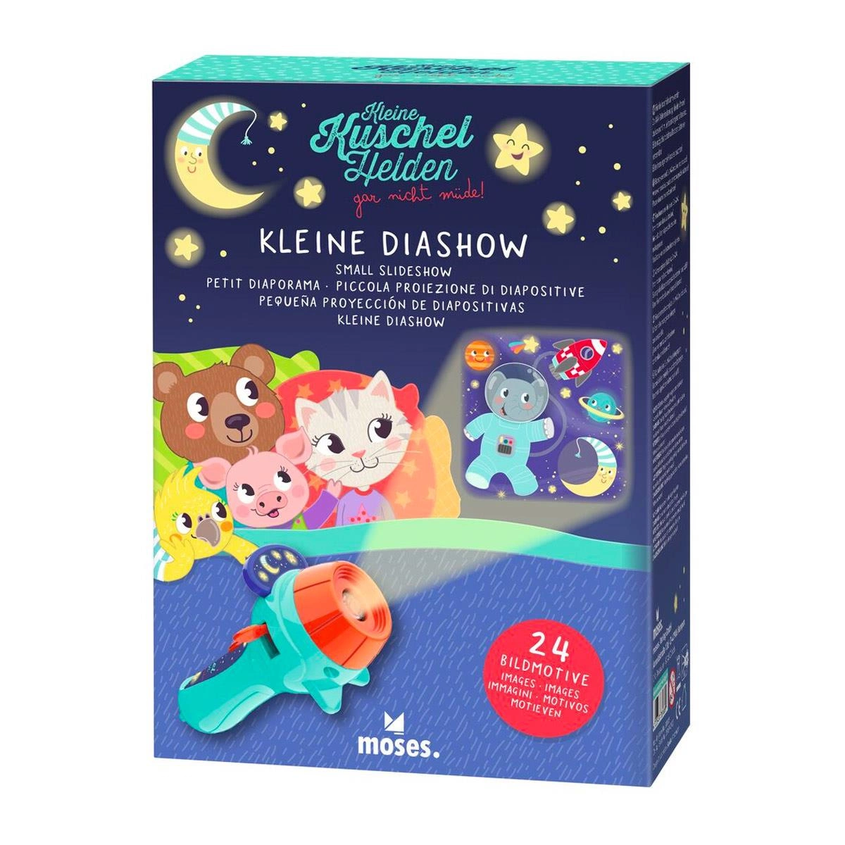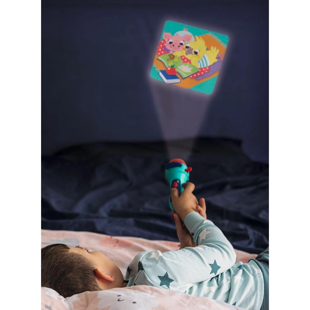 Wspaniały prezent, niezwykły pokaz, który możesz przenieść do pokoju dziecinnego za pomocą latarki - projektora. W tym celu należy włączyć latarkę, wsunąć kółeczko z przeźroczami w szczelinę powstałą po odciągnięciu ruchomej części i skierować na ścianę w zaciemnionym pokoju. Pokaz slajdów z małymi pluszowymi bohaterami zamienia bajkę na dobranoc w interaktywną zabawę! Za pomocą małego projektora można opowiedzieć w sumie trzy historie z ośmioma obrazami: Słodkie Sny, Pory Roku, Czas Spać. Przyglądając się uroczym zwierzakom i słuchając zaczarowanej opowieści, dzieci z pewnością szybko się zmęczą, a ich powieki będą powoli opadać. Niezastąpiony w pokoju dziecięcym, wzbogacenie wieczornego rytuału i wspaniały prezent!