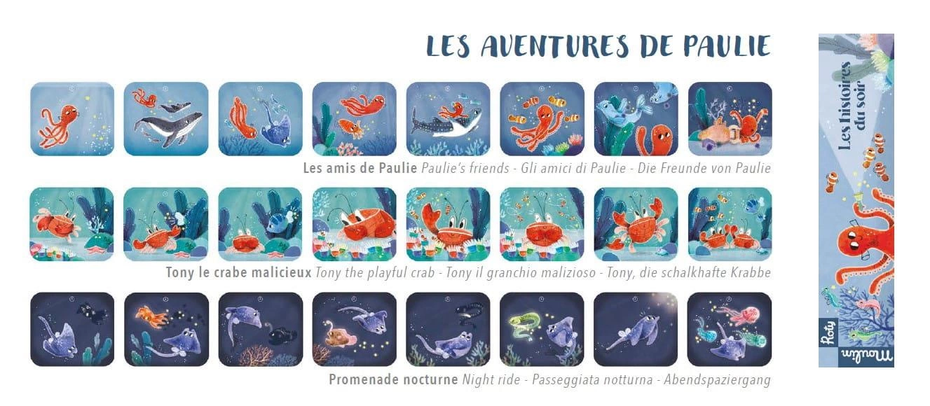 Zestaw zawiera 3 bajki : Przyjaciele ośmiornicy, Zabawy kraba, Nocne pływanie.