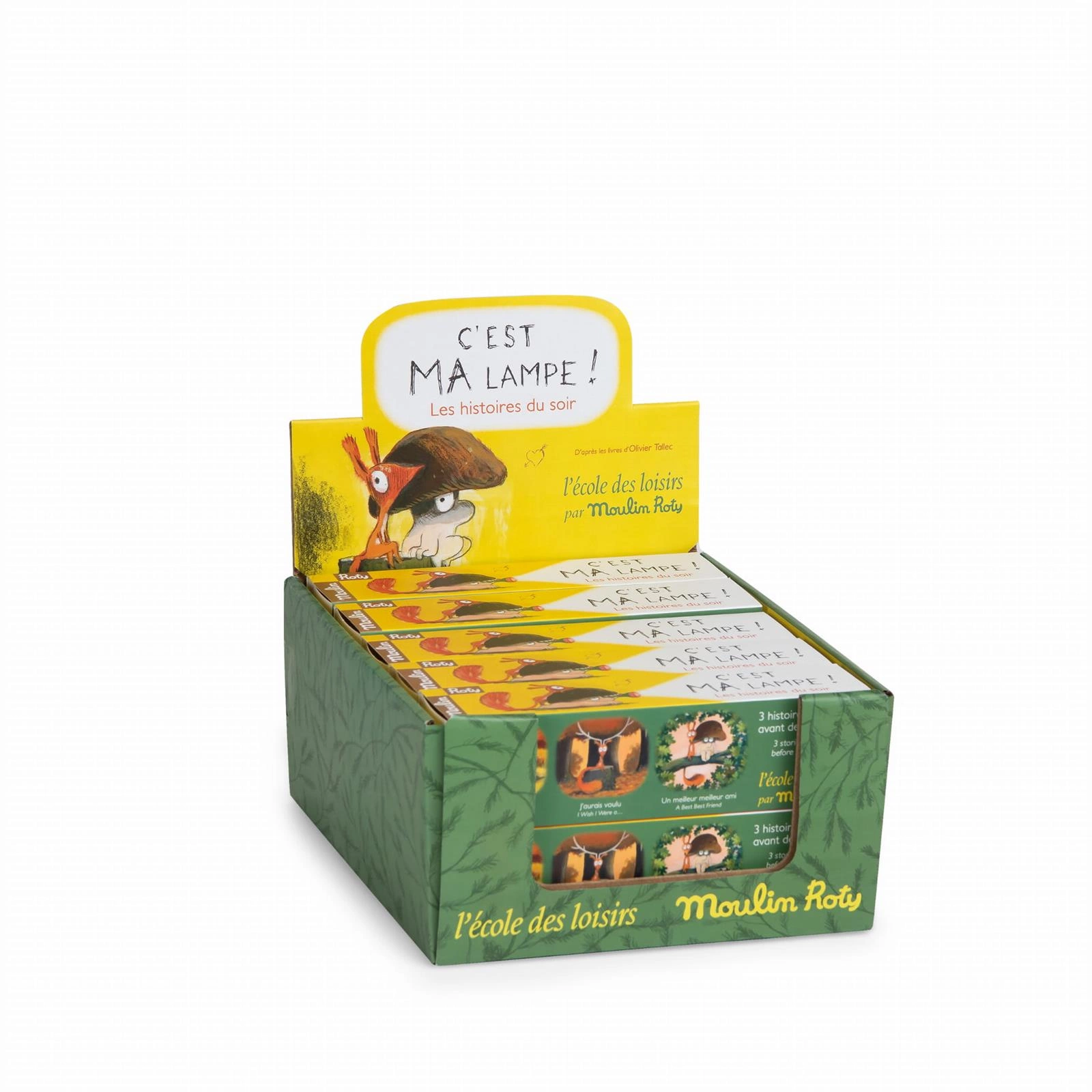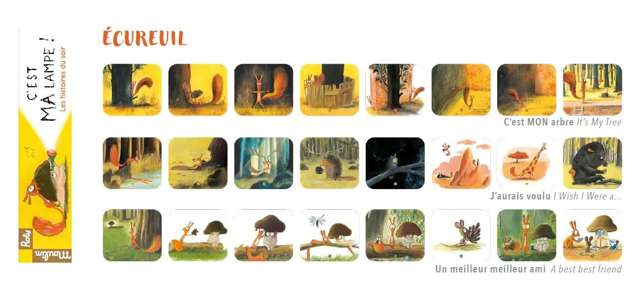 Latarka projektor francuskiej marki Moulin Roty. W zestawie znajdują się 3 dyski, każdy z nich opowiada inną historię o wiewiórce, która nie chciała byc wiewiórką: To moje drzewo, Życzenie, Najlepszy przyjaciel.
