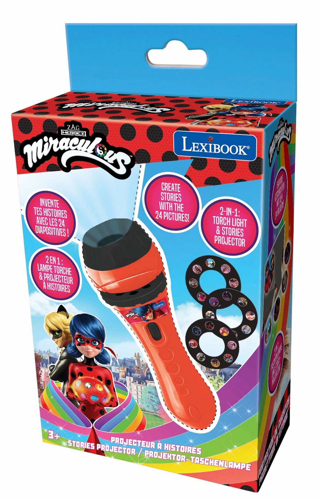 * Projektor Miraculous z dołączonymi 3 dyskami (24 obrazy). Przywołaj Biedronkę, Czarnego Kota i ich zwierzaki Plaga i Tikki, aby uzyskać trochę światła w ciemności!