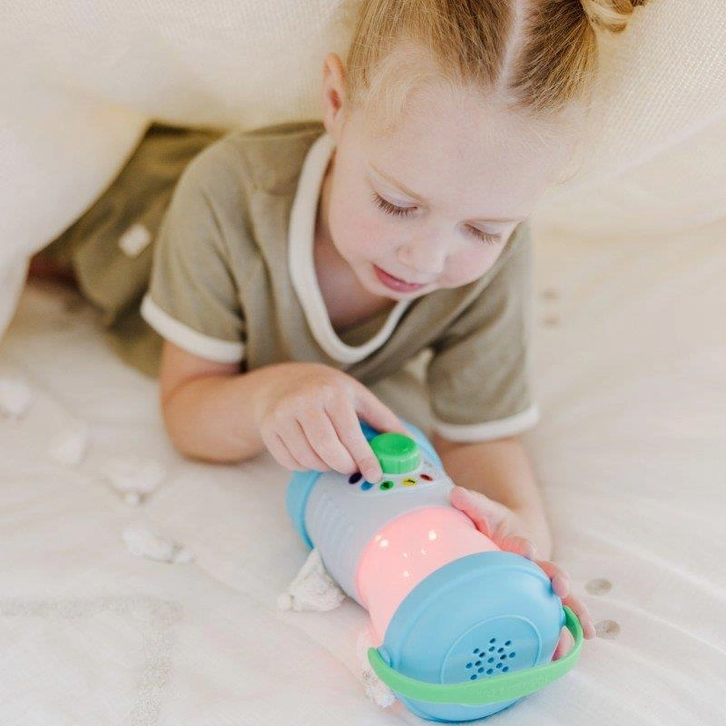 Latarnia świeci w sześciu różnych kolorach – białym, czerwonym, żółtym, zielonym, niebieskim i fioletowym. Do każdego z nich przypisano różne, pasujące do danej barwy, dźwięki, odtwarzane w pętli do 30 minut. Trzy dwustronne karty do ustawienia scenek pomogą Ci przenieść pociechę w różne miejsca – w pobliżu trzaskającego ogniska, lasu z sową, fal oceanu, płynącego strumienia oraz deszczu z odległymi grzmotami.