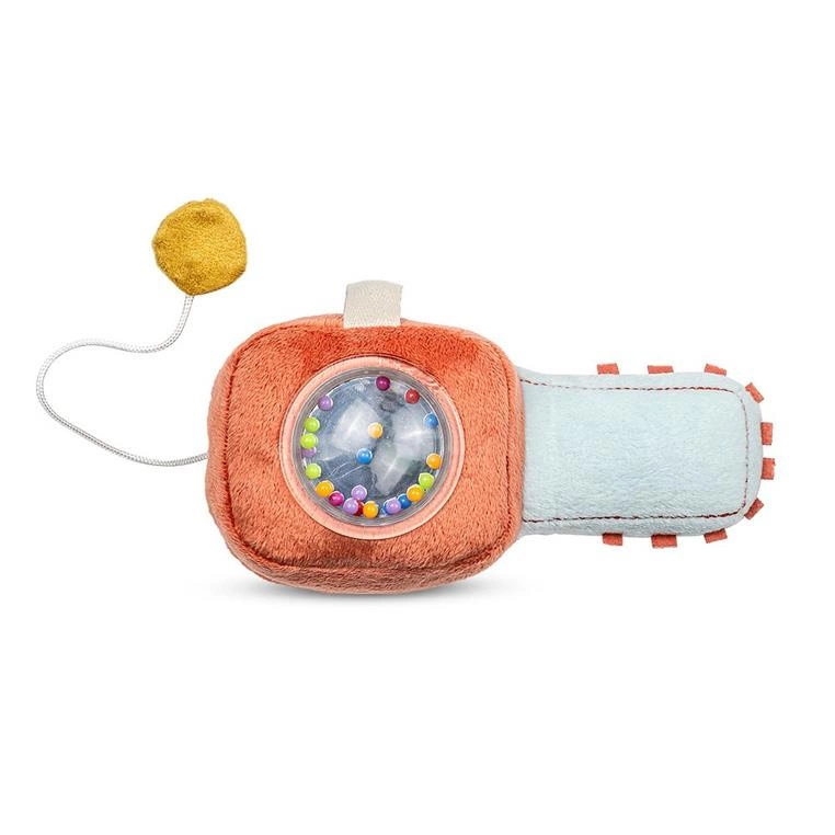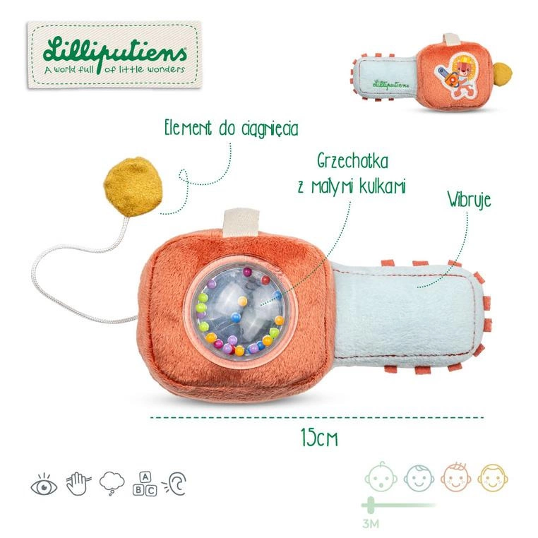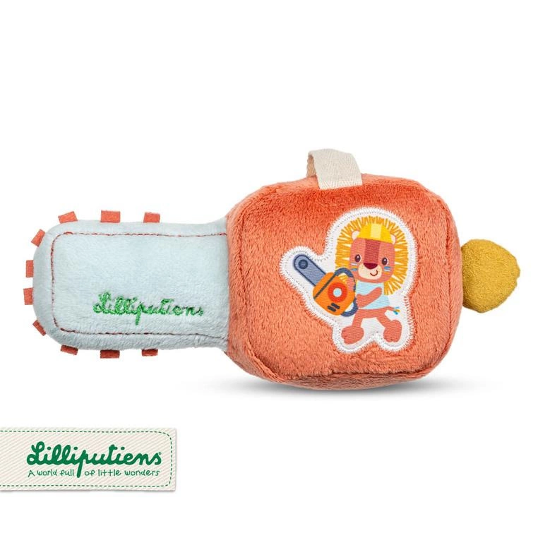 Grzechotka-piła łańcuchowa z kolekcji Lew Jack belgijskiej marki Lilliputiens to aktywizująca zabawka dla niemowląt. Ma postać pluszowej piły łańcuchowej z naszywką lwa w kasku. Potrząsana wydaje przyjemny dla ucha dźwięk (na boku ma okienko w kuleczkami), a po pociągnięciu za sznurek – wibruje. Jest poręczna i wykonana z różnorodnych materiałów, co dodatkowo stymuluje sensorycznie. Zabawka rozwija małą motorykę (chwytanie, potrząsanie, pociąganie), aktywizuje zmysł słuchu (grzechotka, wibracje), wzroku i dotyku (m.in. wypustki, imitujące łańcuch).