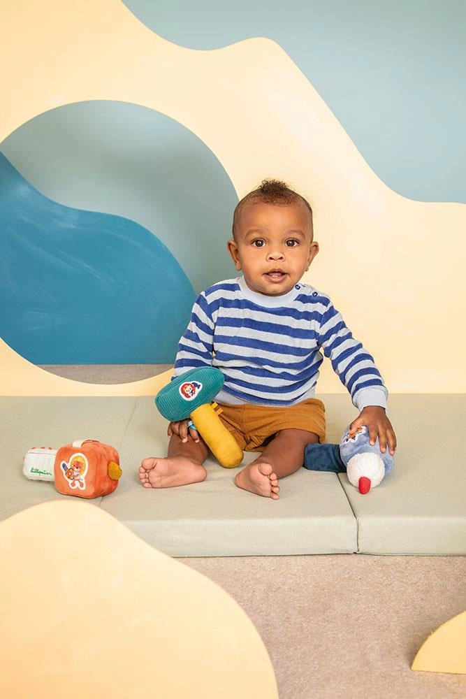 Grzechotka-wiertarka z kolekcji Piesek Jules belgijskiej marki Lilliputiens to aktywizująca zabawka dla niemowląt. Ma postać pluszowej wiertarki z naszywką pieska w kasku. Potrząsana wydaje przyjemny dla ucha dźwięk. Jest poręczna i wykonana z różnorodnych materiałów, co dodatkowo stymuluje sensorycznie. Zabawka rozwija małą motorykę (chwytanie i potrząsanie), aktywizuje zmysł słuchu (piszczałka), wzroku i dotyku.