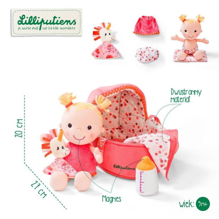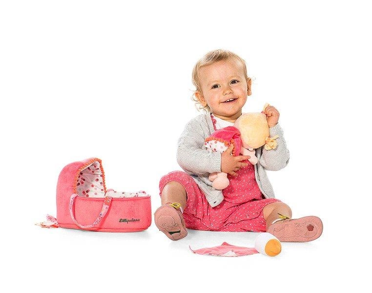 LILLIPUTIENS Lalka dzidziuś w gondoli z przytulanką i butelką mleka Louise 9 m+