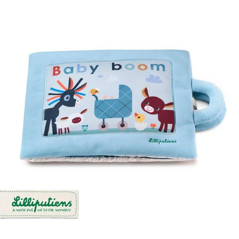 Książeczka aktywizująca „Baby boom” z kolekcji Farma belgijskiej marki Lilliputiens to idealna pierwsza lektura dla maluszka. Na okładce znajduje się wózek z niemowlakiem w otoczeniu małych zwierzątek z farmy. Kolejne strony przedstawiają mamusie w chwili, gdy ich młode przychodzą na świat. Dzięki dołączonym do książki mini-przytulankom – są to: cielątko, kaczątko, kurczaczek, jagniątko, oślątko i niemowlę – można zobaczyć, jak to się dzieje. U krówki, oślicy, owieczki i człowieka można wyjąć dzieciątko z brzucha mamy - kieszonki, zaś u kury i kaczki – kieszonką są jaja, z których wykluwają się pisklaki. Przytulanki można też umieścić na tylnej okładce książki, gdzie poznają one otaczający ich świat – staw, łąkę czy zagrodę. Niemowlę można zabrać na spacer w wózku, pchanym przez starszego brata. Kolorowe, emocjonujące, pełne wydarzeń obrazki doskonale nadają się do snucia opowieści i łatwo zapadają w pamięć. Książeczka ma wygodne do przenoszenia rączki, jest perfekcyjnie wykończona, z dbałością o każdy szczegół i w pełni bezpieczna dla dziecka. Pobudza dziecięcą wyobraźnię i ciekawość, aktywizuje zmysły wzroku, dotyku i sferę uczuciową. Jest także świetnym sposobem na zapoznanie maluszka z cudem narodzin.