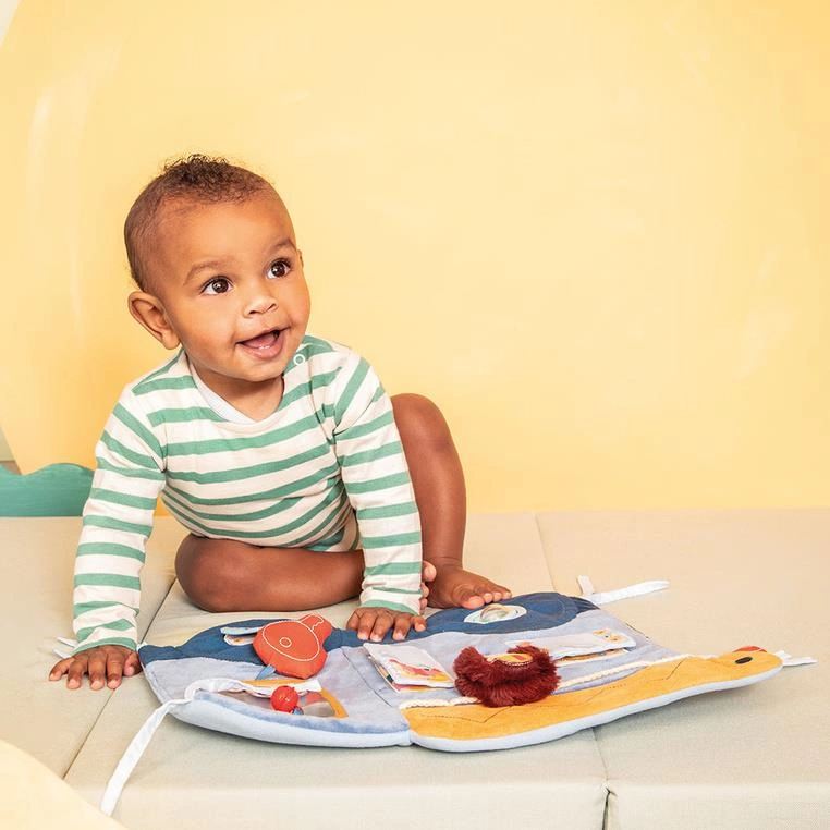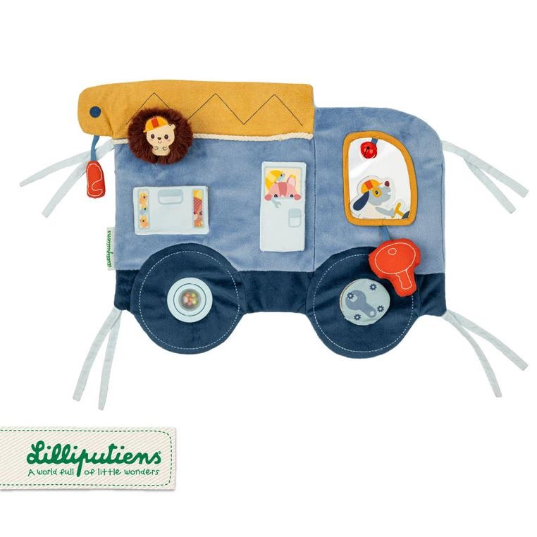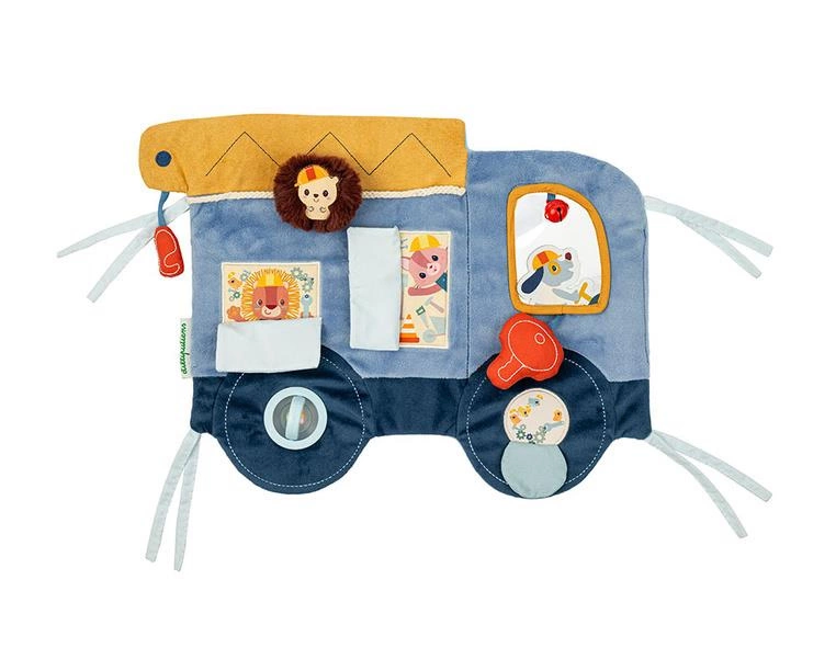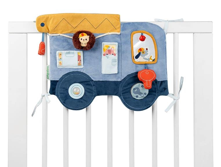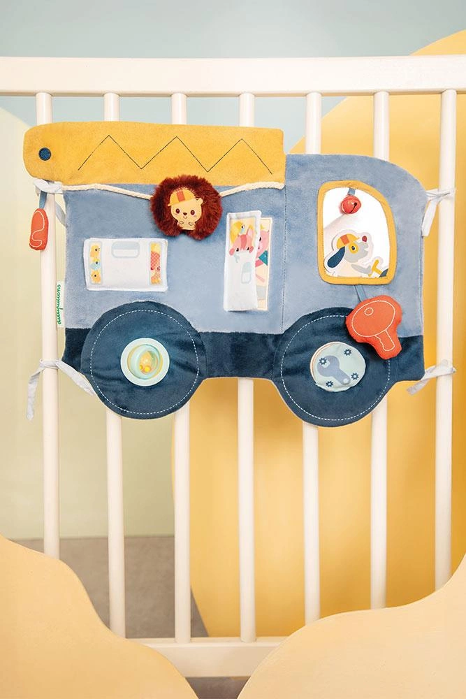 Miękka tablica aktywizująca Samochód Pieska Julesa belgijskiej marki Lilliputiens to niebanalne i wielofunkcyjne źródło rozrywki i nauki dla ciekawskich maluszków. Spory panel w kształcie ciężarówki można – dzięki podwójnym tasiemkom na jego czterech rogach – przymocować np. do szczebelków łóżeczka lub innej podobnej powierzchni. Niebieski samochód oferuje mnóstwo różnorodnych aktywności, w tym: kilka szeleszczących i wystających elementów, trzy otwierane okienka z niespodziankami, jeżyka do przesuwania po sznurku, grzechotki, w tym z kuleczkami (na kole), bezpieczne lusterko i dzwoneczek. Całość jest solidnie wykonana i w pełni bezpieczna. Zaskakuje i pobudza dziecięcą wyobraźnię. Rozwija koordynację ręka-oko i małą motorykę (chwytanie, potrząsanie, przesuwanie, uchylanie), aktywizuje zmysł słuchu (szelest, klakson, grzechotki), wzroku i dotyku.