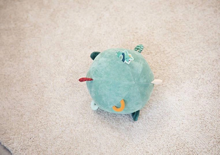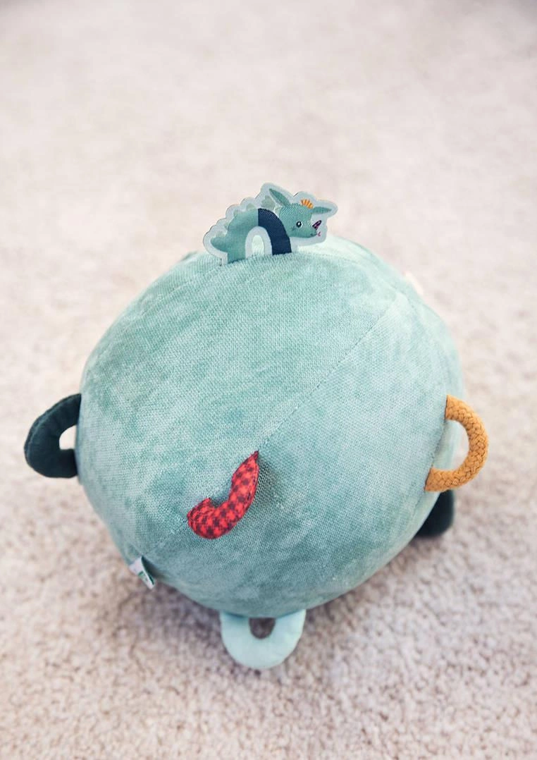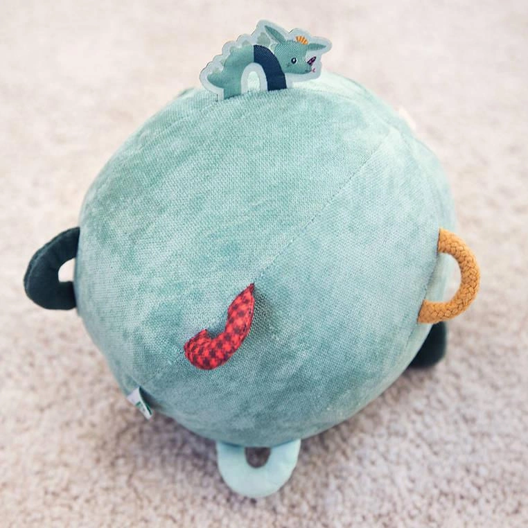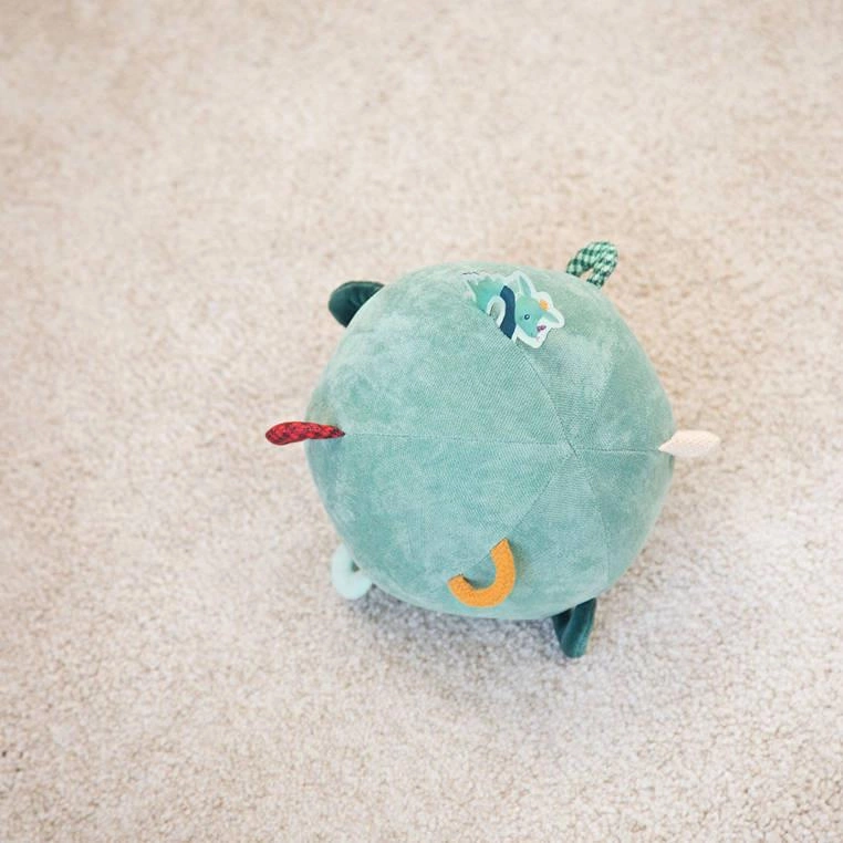 Piłeczka dźwiękowa z kolekcji Smok Joe belgijskiej marki Lilliputiens to miękka aktywizująca zabawka dla niemowląt. Piłka jest wykonana z pastelowozielonej strukturalnej tkaniny, ma wiele stymulujących sensorycznie kolorowych mini-uchwytów i metkę ze Smokiem Joe, a także ukrytą wewnątrz pozytywkę (uruchamianą przyciskiem) z 7 różnymi dźwiękami, m.in. trąbki czy marakasów. Jest poręczna i całkowicie bezpieczna. Odpowiada na potrzebę turlania i rzucania przedmiotów, co jest naturalnym etapem rozwoju maluszka, a przy okazji rozwija małą motorykę (chwyt, potrząsanie), aktywizuje zmysł dotyku i słuchu (gra).