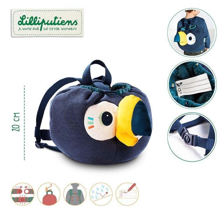Wyjątkowo uroczy mięciutki, okrągły plecaczek w kształcie granatowej głowy Tukana Pablo belgijskiej marki Lilliputiens. Funkcjonalny, lekki i wygodny. Idealny dla maluchów, do przedszkola i na krótkie wycieczki. Jest miękki i puszysty w dotyku, zaciskany gumką i dodatkowo zamykany paskiem na rzep. Przód plecaka zdobią duże oczy i charakterystyczny wielki dziób. Szelki z regulacją długości, dodatkowy pasek stabilizujący i odciążający plecy, zapinany na łatwy w obsłudze zatrzask oraz uchwyt do zawieszenia są w kolorze granatowym. Plecak uszyto z wysokiej jakości materiałów. Jest perfekcyjnie wykończony, z dbałością o każdy szczegół i w pełni bezpieczny dla dziecka.