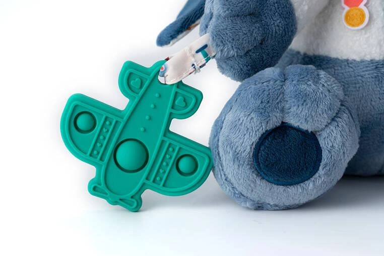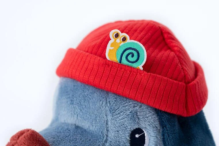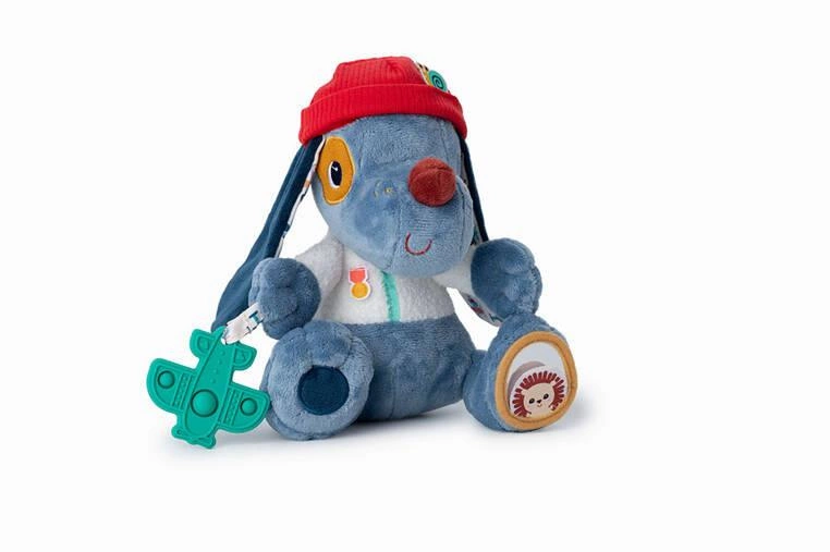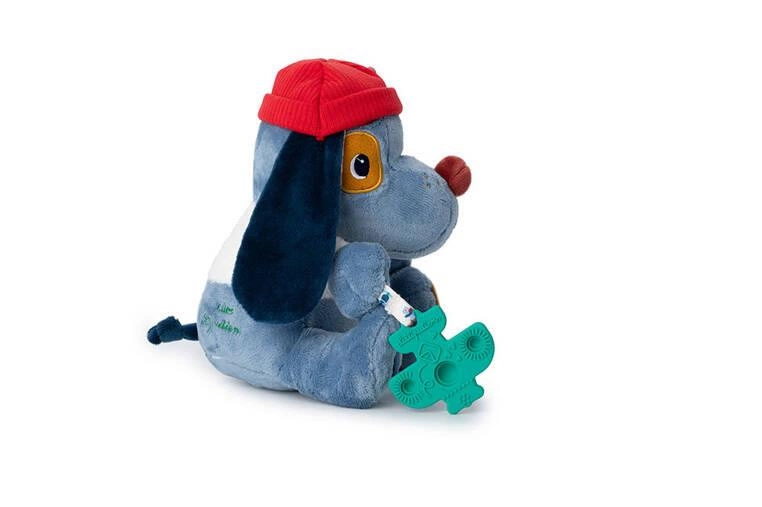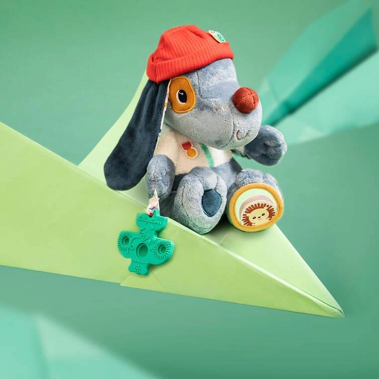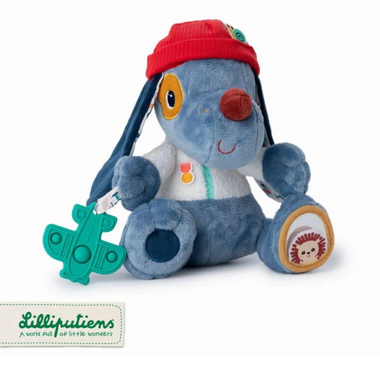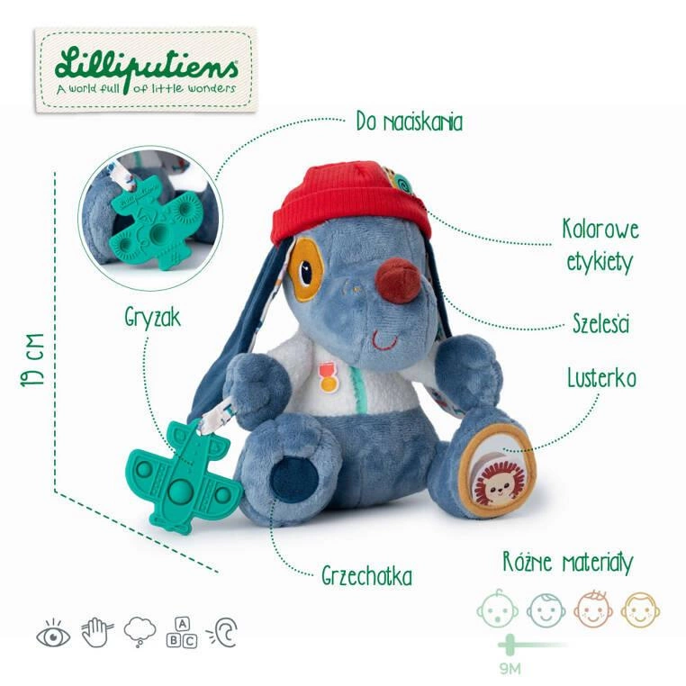 Przytulanka aktywizująca z kolekcji Piesek Jules belgijskiej marki Lilliputiens to niebanalne, miękkie i wielofunkcyjne źródło rozrywki i nauki dla ciekawskich maluszków. Ma postać wesołego niebieskiego pieska w białej futerkowej bluzie z naszywką medalu i czerwonej czapce z naszywką ślimaczka. Piesek ma długie uszy, z których jedno szeleści przy pocieraniu, ogonek z supełkiem i szerokie łapki. Przy jednej z nich zamocowany jest silikonowy samolot pop-it, który może też pełnić funkcję gryzaka. Na spodzie jednej z nóg znajduje się bezpieczne lusterko z aplikacją jeżyka, druga noga grzechocze.